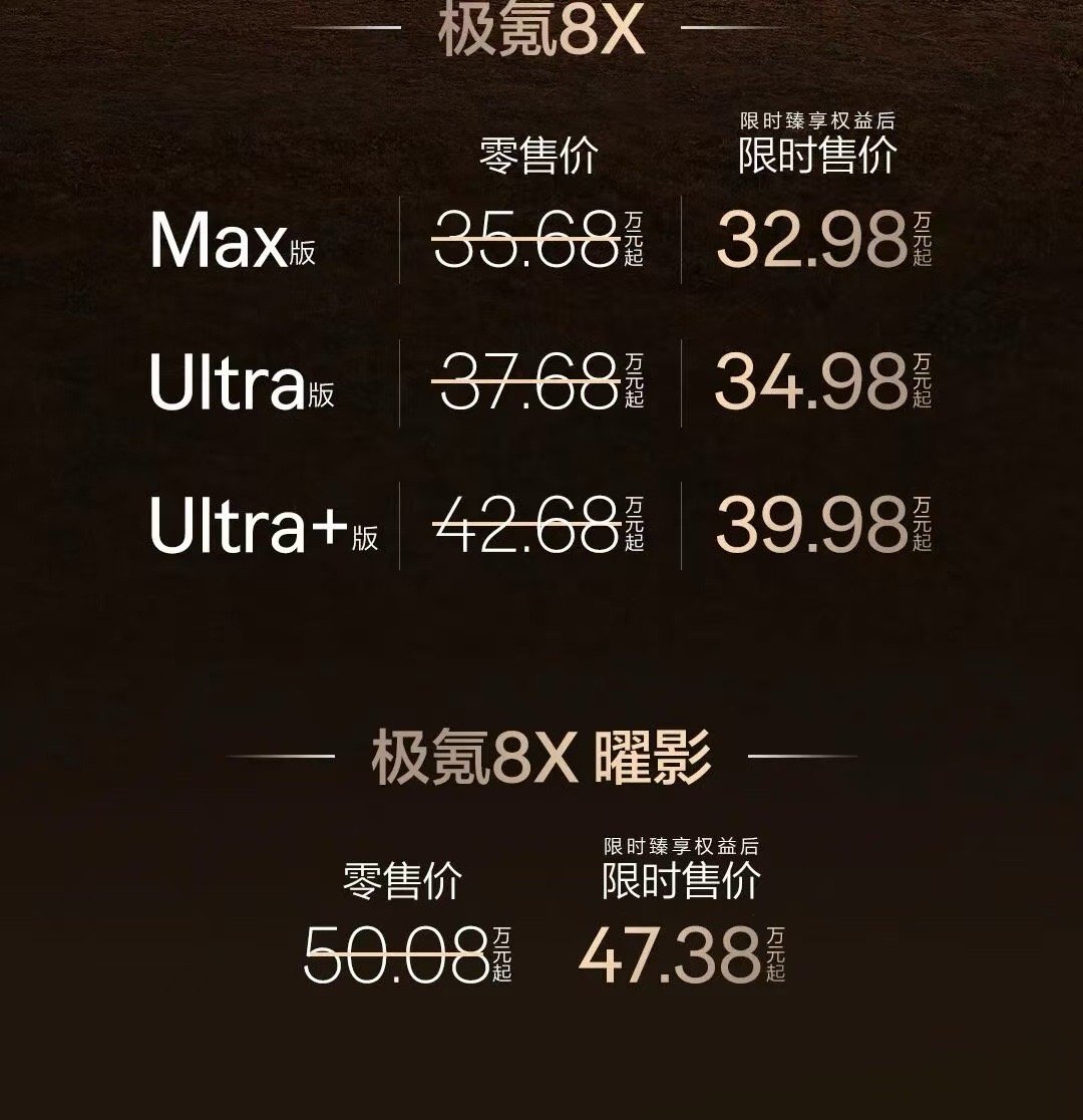 极氪8X在4月17日上市了,什么样的人会买它?一面是社会中坚的责任感,一面是没被磨平的少年心。每年跑自驾:西藏、新疆、318。需要一台车能带家人去远方,也能让自己在无人区爽一把。1416km续航,长途不焦虑;3.7秒加速,热爱不妥协;大五座+AI底盘,从容尽兴。责任和热爱,在同一辆车上。极氪8X上市限时售价32.98万元起