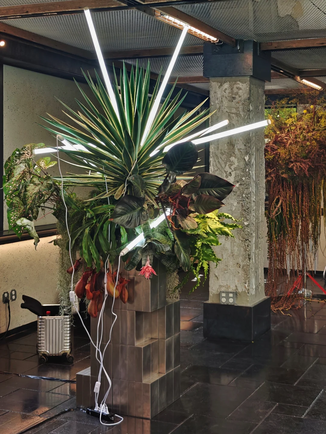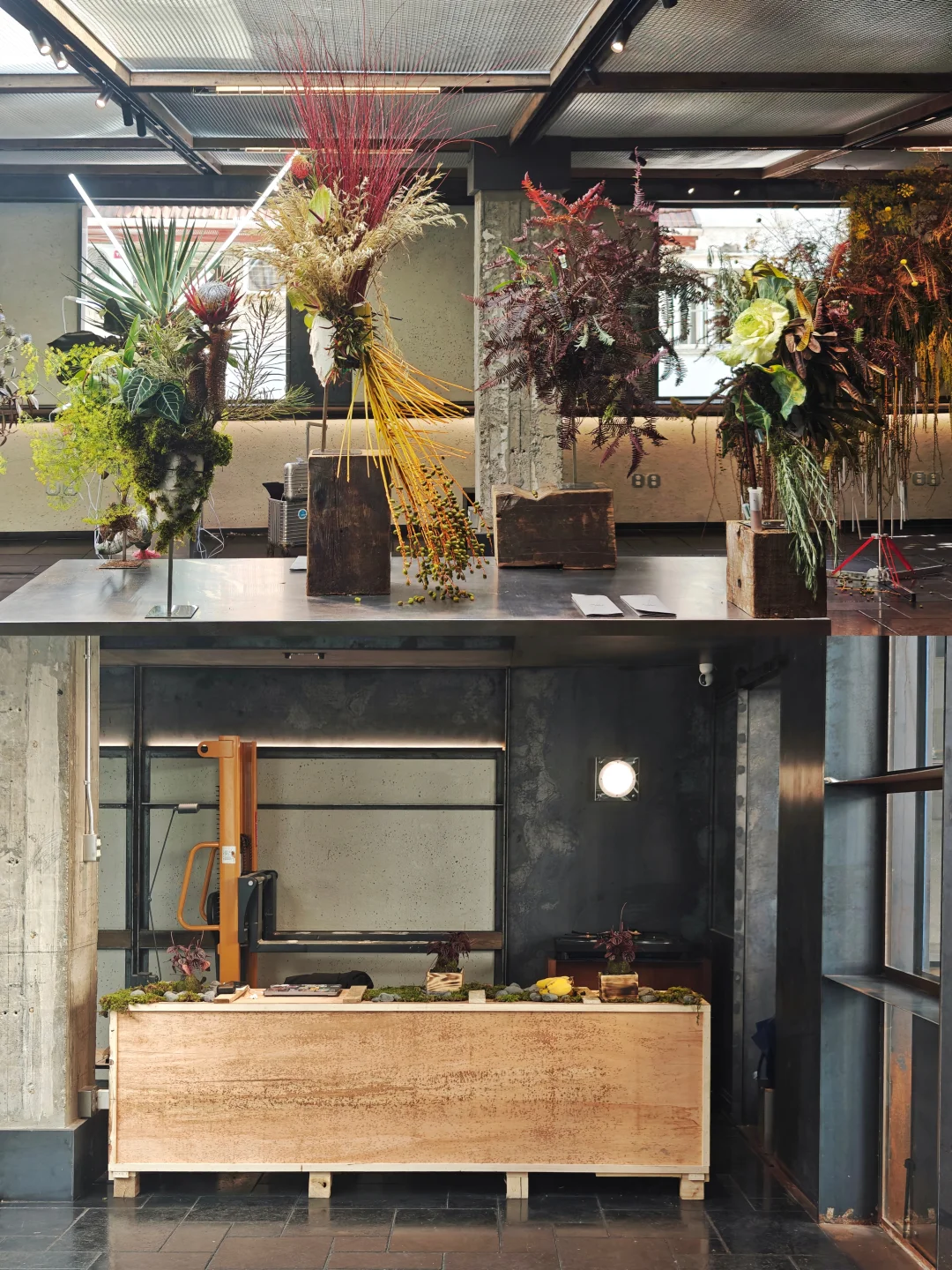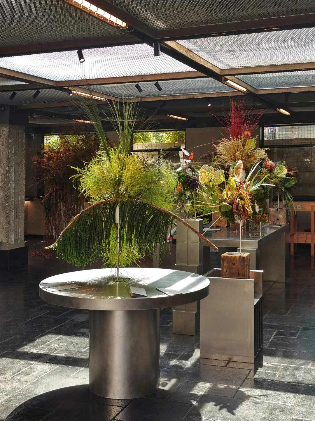🪑空间的设计风格延续了工业风,同时有着极强的开放性,刻意引入、阳光雨水等自然元素。展览中使用的展示家具来自C2 Gallery,冷峻锋利的银色金属与植物形成对比,先锋感拉满。