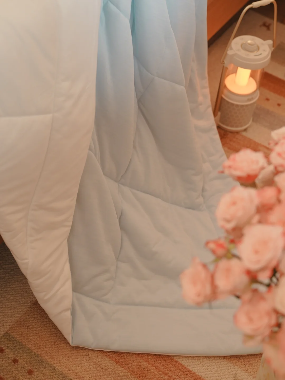 胡恩巴尔凉被,淡蓝色真的好温柔,双面设计,一面凉感一面亲肤,透气不闷汗,轻薄又有包裹感,就像裹着一片云,裸睡都超舒服[赞R]。