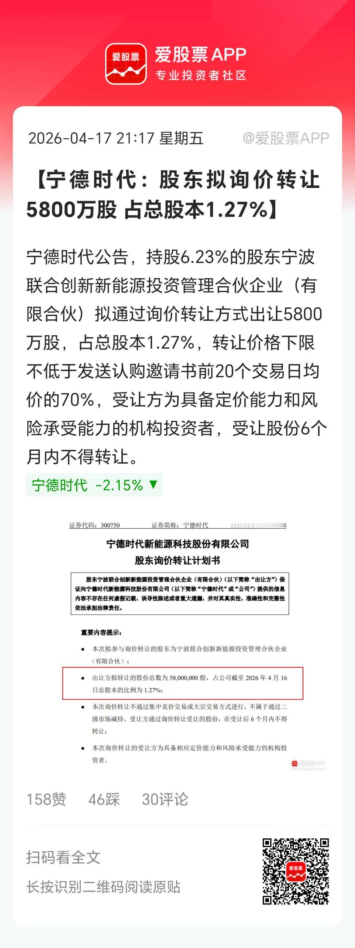宁德时代来利空了,第四大股东询价转让5800万股,按现在市值高达257亿。现在减持都不说减持,都搞询价转让,这风气学坏了啊。