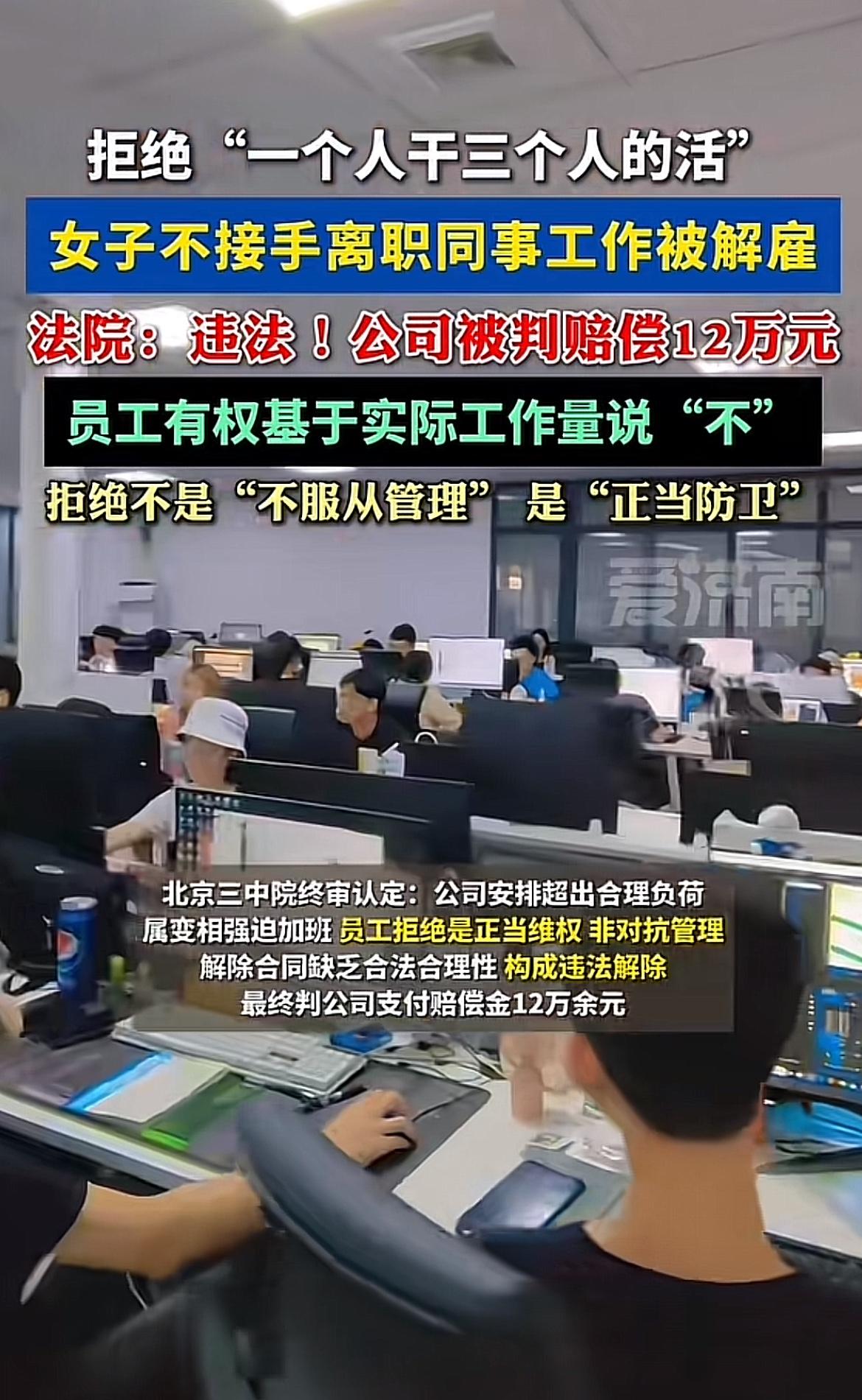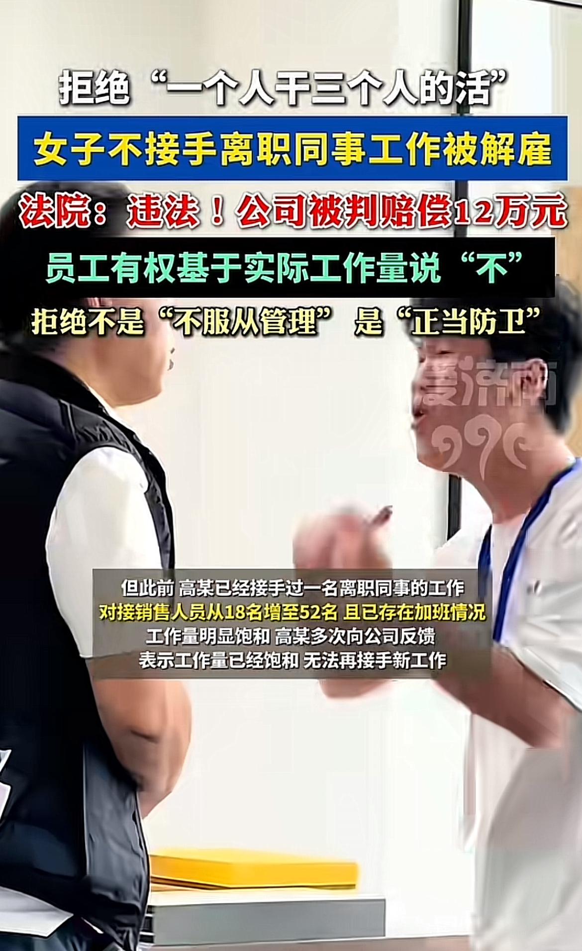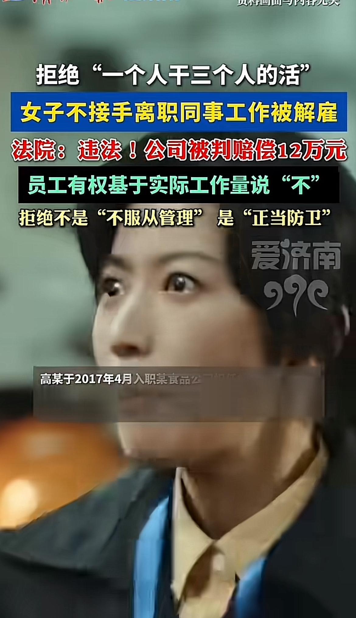 这新闻太让人解气了!一女子拒绝接手离职同事工作,竟被公司解雇。公司也太不讲理了,离职同事的工作又不是女子本职工作,凭啥强行让她承担啊。