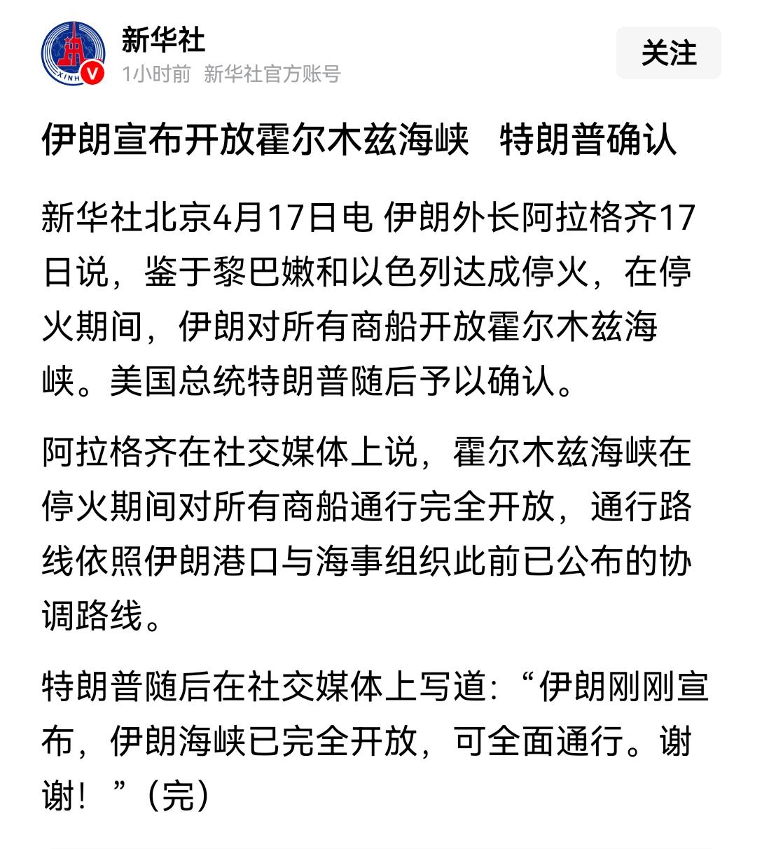 果然,以色列🆚黎巴嫩递个台阶,美伊马上就“下”了——霍尔木兹海峡开放[烟花] 当然,这只是“暂时开放”[思考]只不过,或许拖个两三个月,有些事自然就…忘了[灵光一闪] [吃瓜群众]迷迷瞪瞪开局,稀里糊涂收场…也算是“太平了”[可怜]