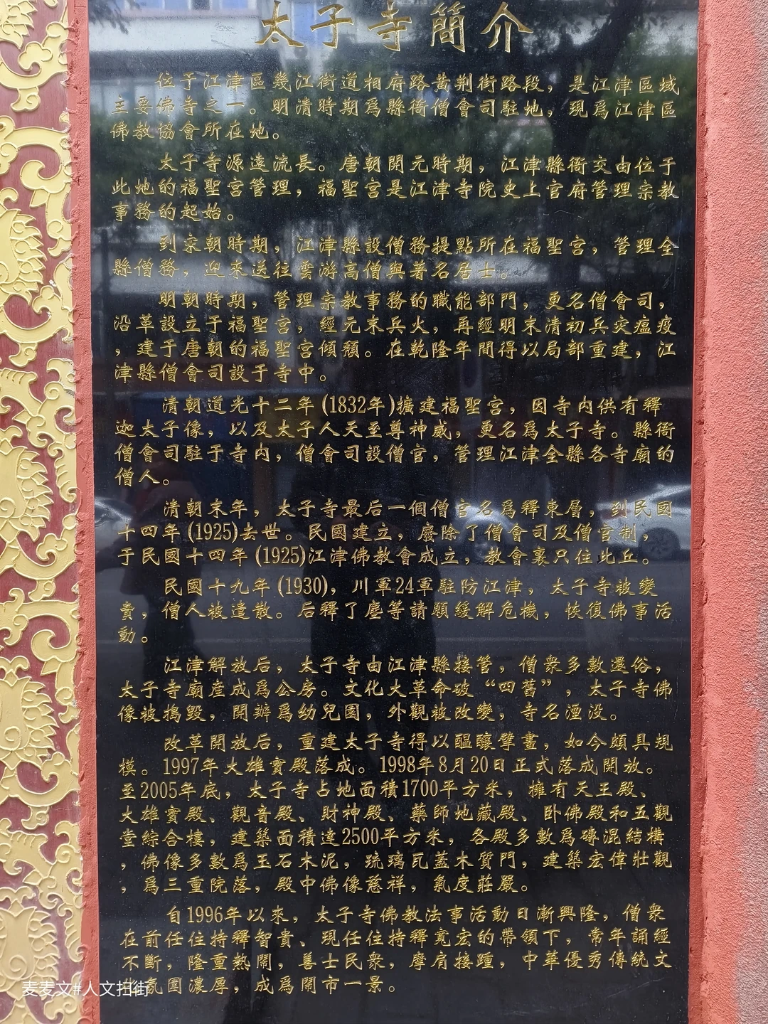 在重庆市江津区几江街道相府路的烟火里,藏着一座见证了江津佛教史的千年古刹——太子寺。它的前身是唐朝开元年间的福圣宫,曾是江津县衙管理宗教事务的官署,宋元明清历代都是江津僧会司驻地,统管全县僧尼与寺庙,是名副其实的川东佛教重镇。清道光十二年(1832年),因寺内供奉释迦太子像,正式更名太子寺,沿用至今。