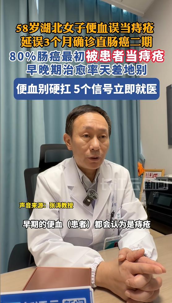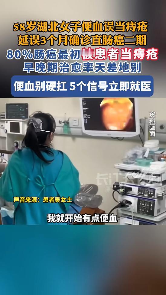(信息来源:《58岁湖北女子便血误当痔疮,延误3个月确诊直肠癌二期。80%肠癌最初被患者当痔疮早晚期治愈率天差地别,便血别硬扛,5个信号立即就医》长江云新闻)