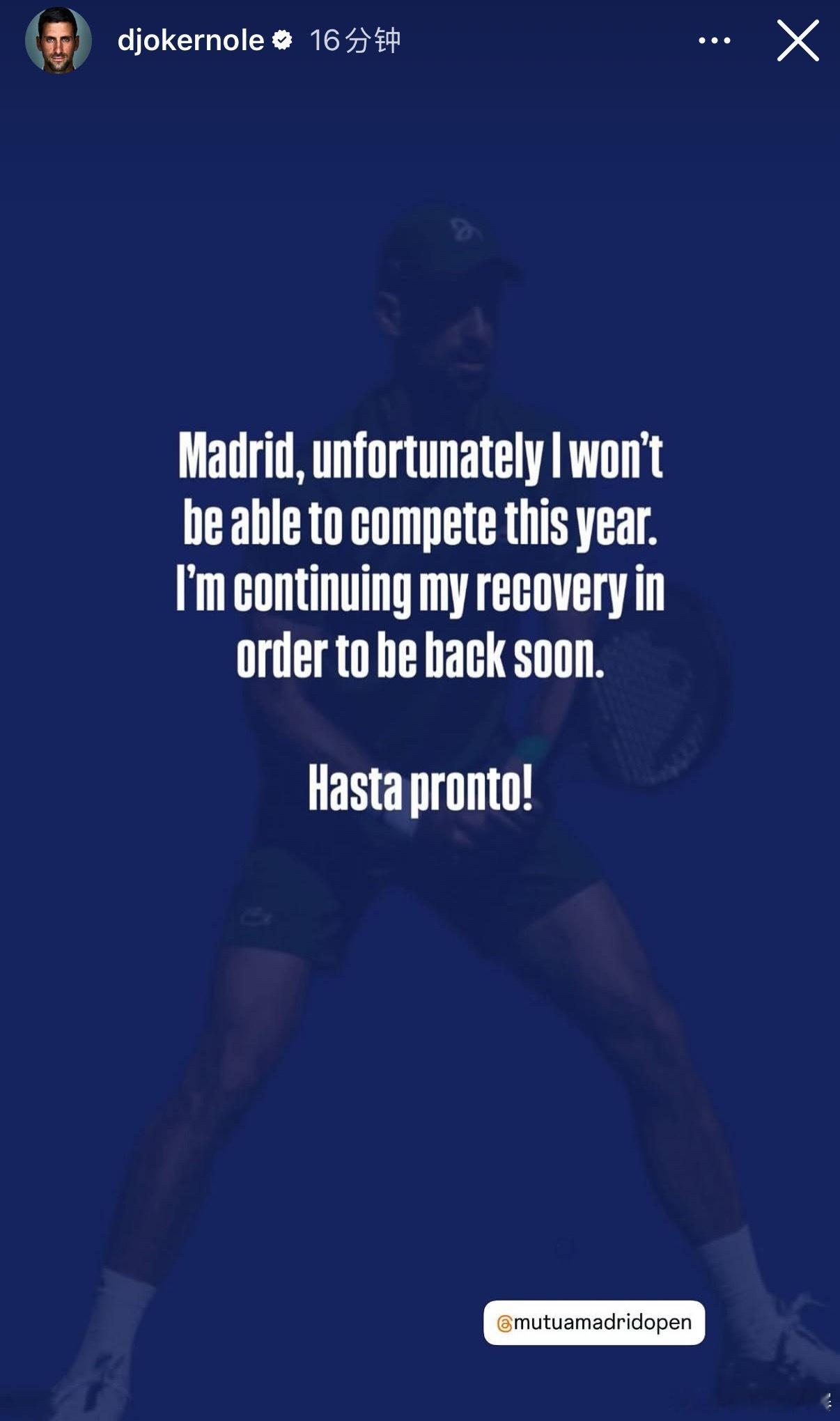 德约科维奇在个人社交媒体宣布:“很遗憾我今年无法参加马德里大师赛。目前我专注于继续康复,以便尽快回归。”