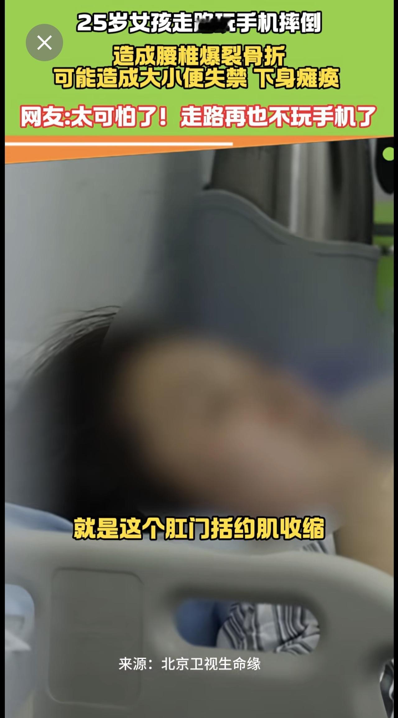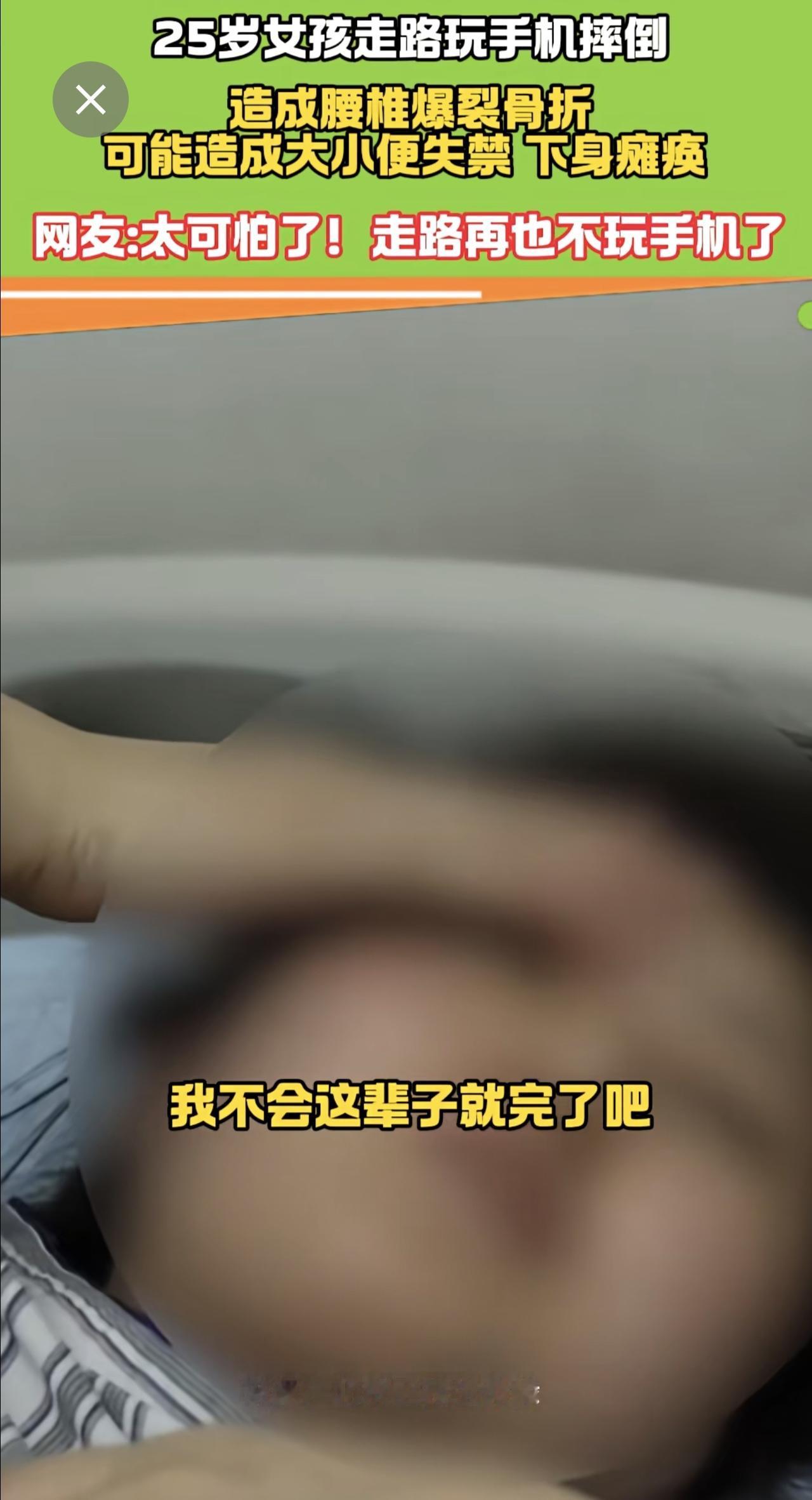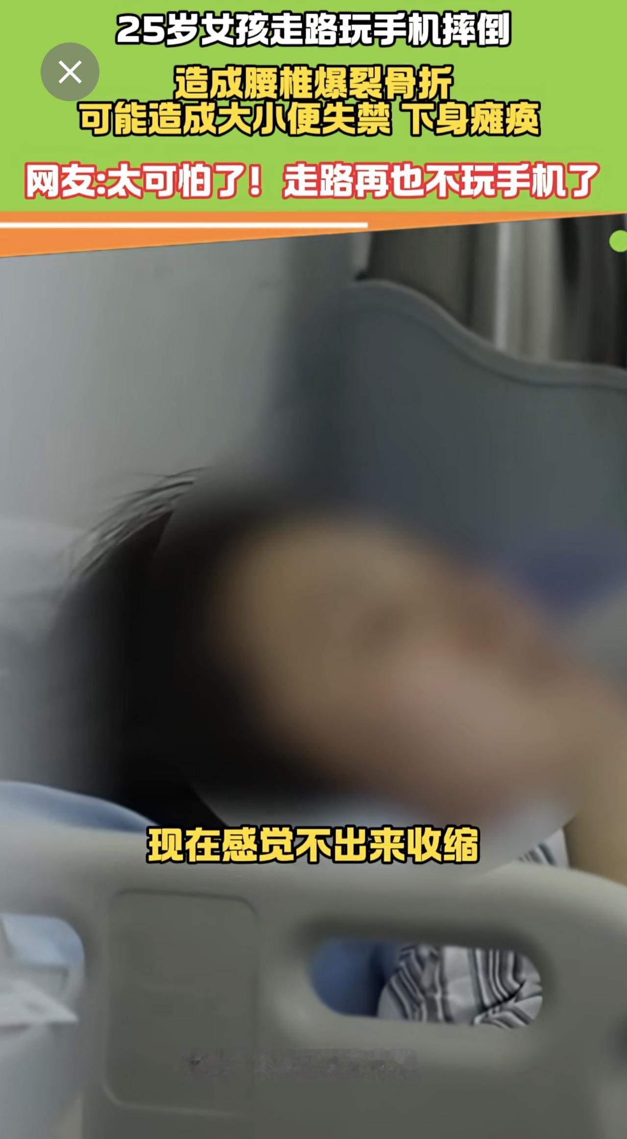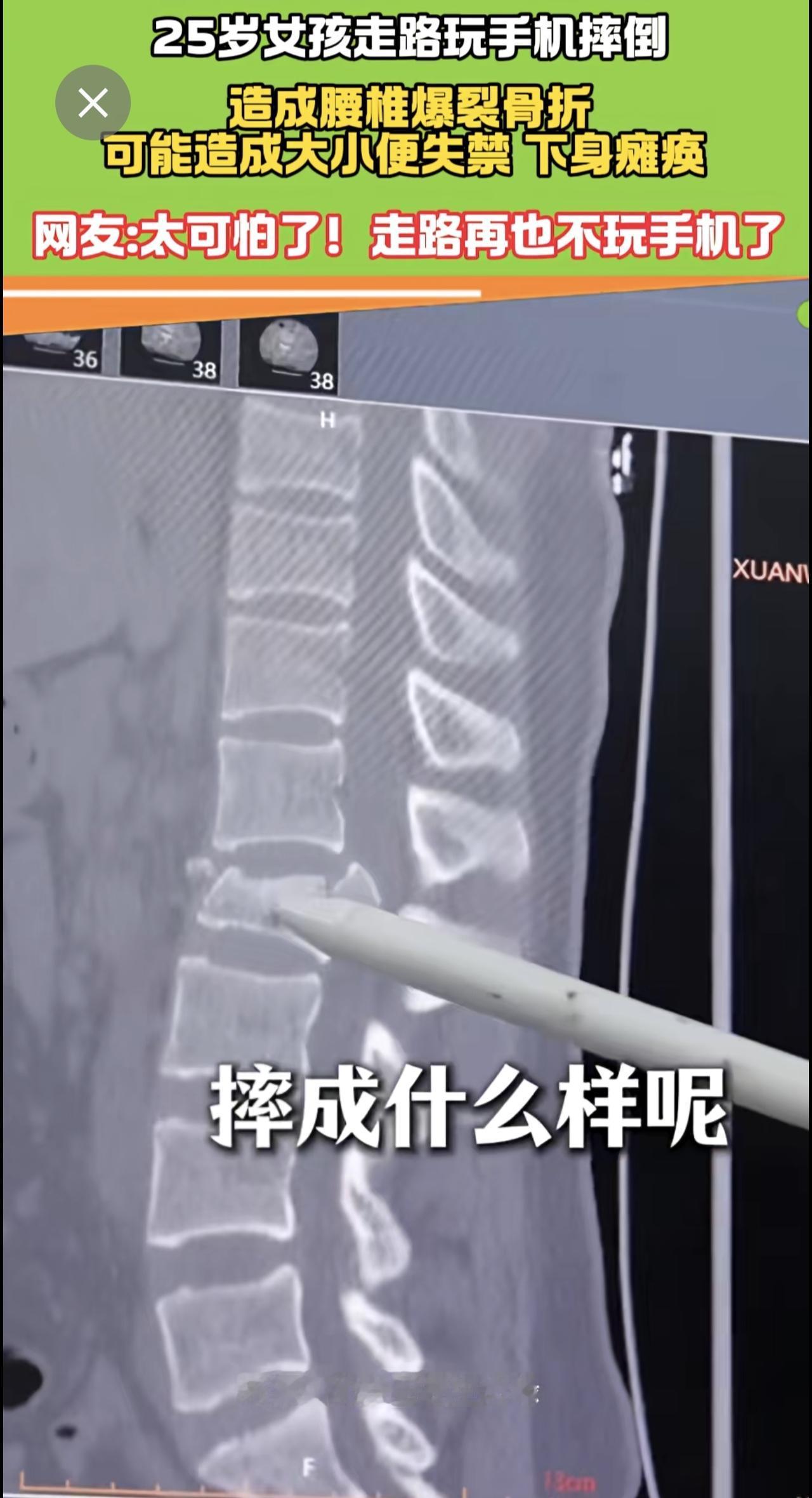 25岁女走路孩玩手机摔倒 腰椎爆裂骨折 医生:有瘫痪风险! 手机 瘫痪