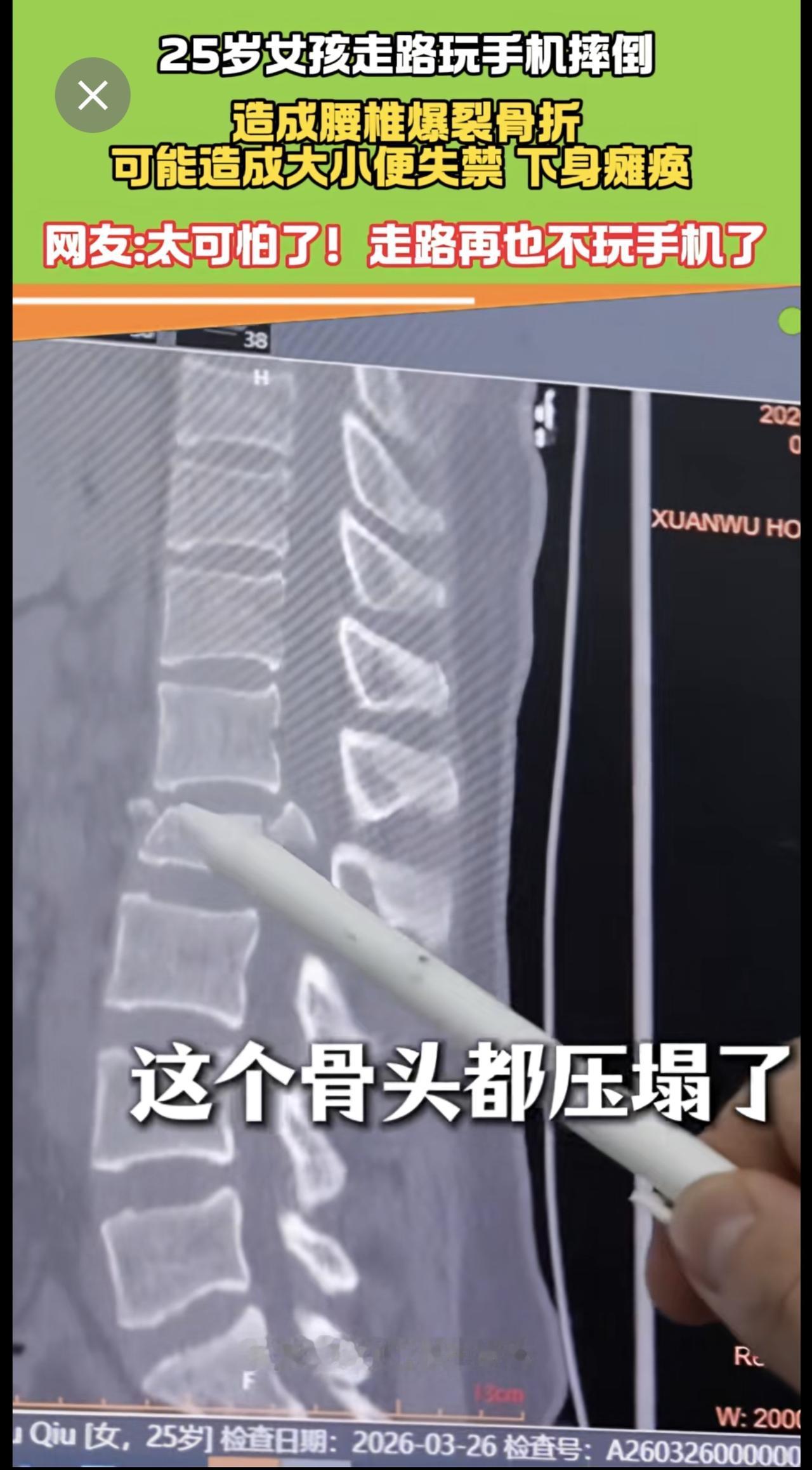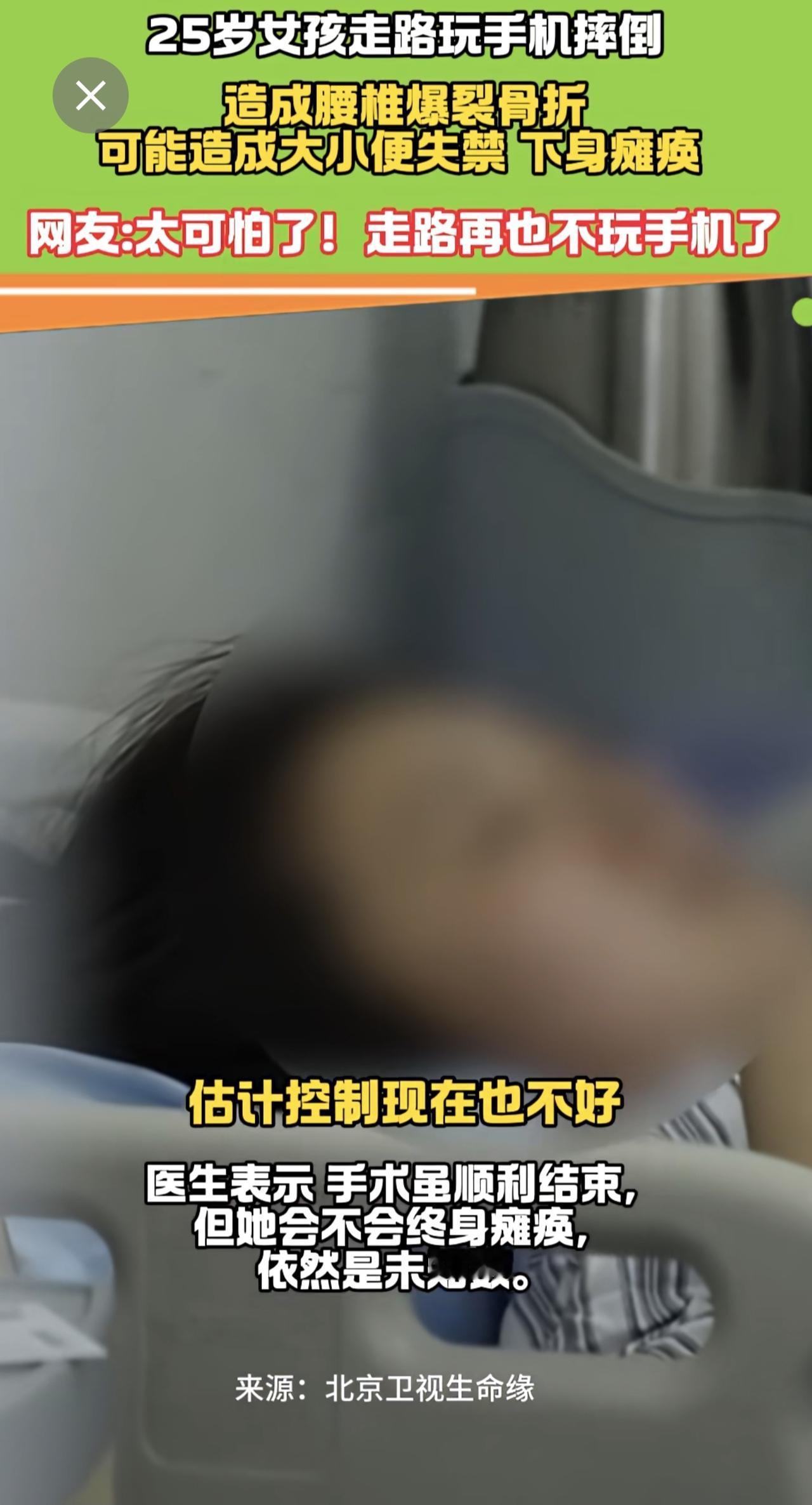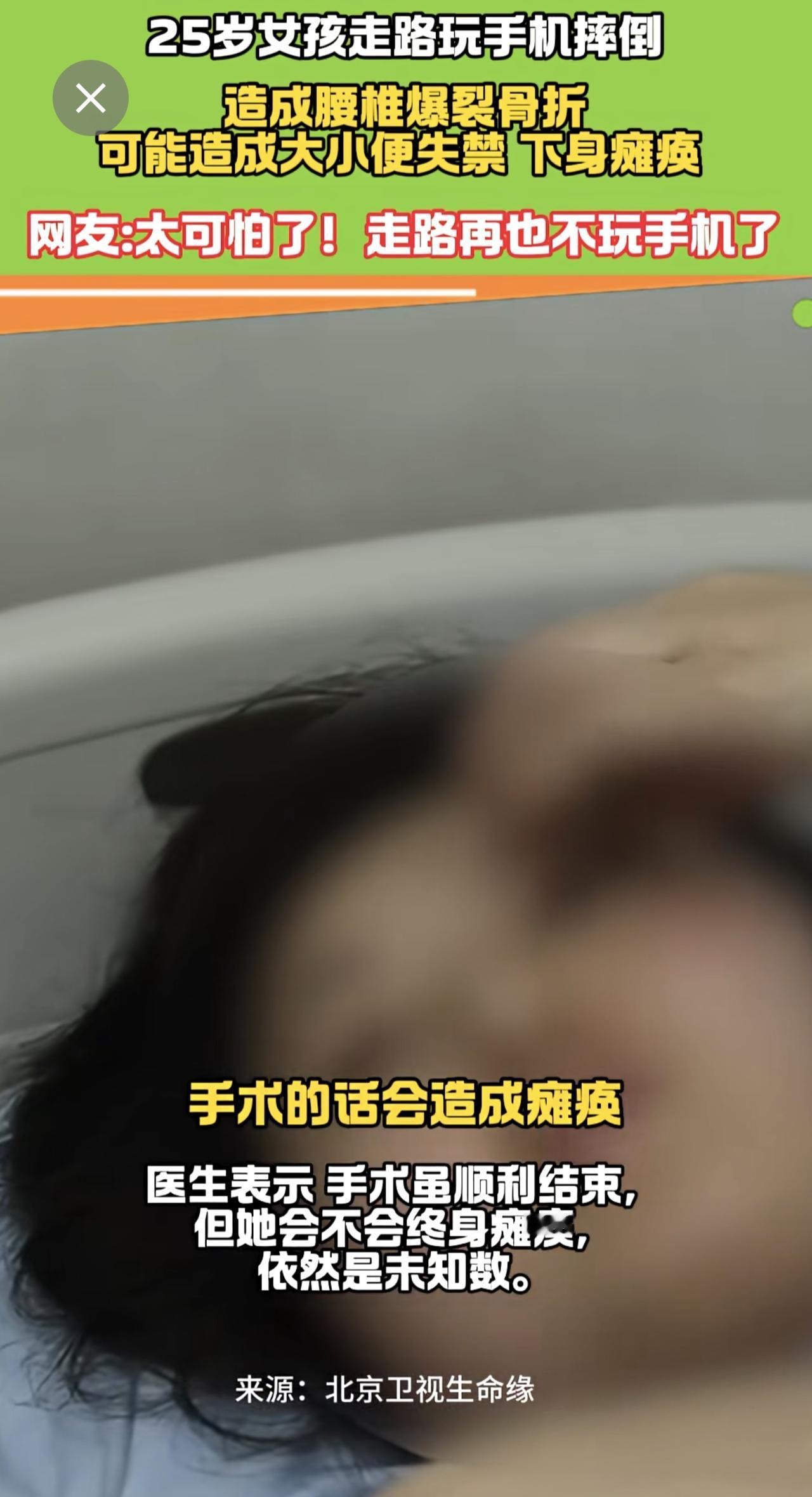 25岁女走路孩玩手机摔倒 腰椎爆裂骨折 医生:有瘫痪风险! 手机 瘫痪