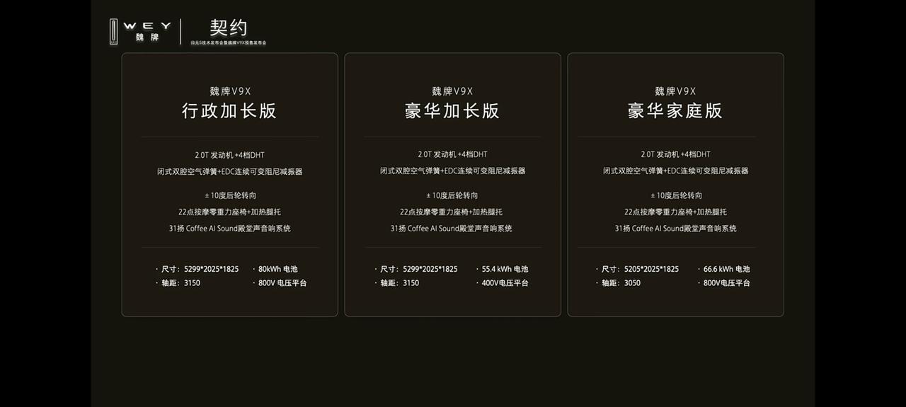 魏牌V9X开启预售,预售价38.18万-41.18万,分长轴距和短轴距,分别是3150mm和3050mm,三种电池版本,分别是80度、55.4度和66.6度,3000元抵1万元购车尾款,还有购车无忧礼。豪华加长版、行政加长版,上市即交付,豪华家庭版现在下单预计7月份交付。
