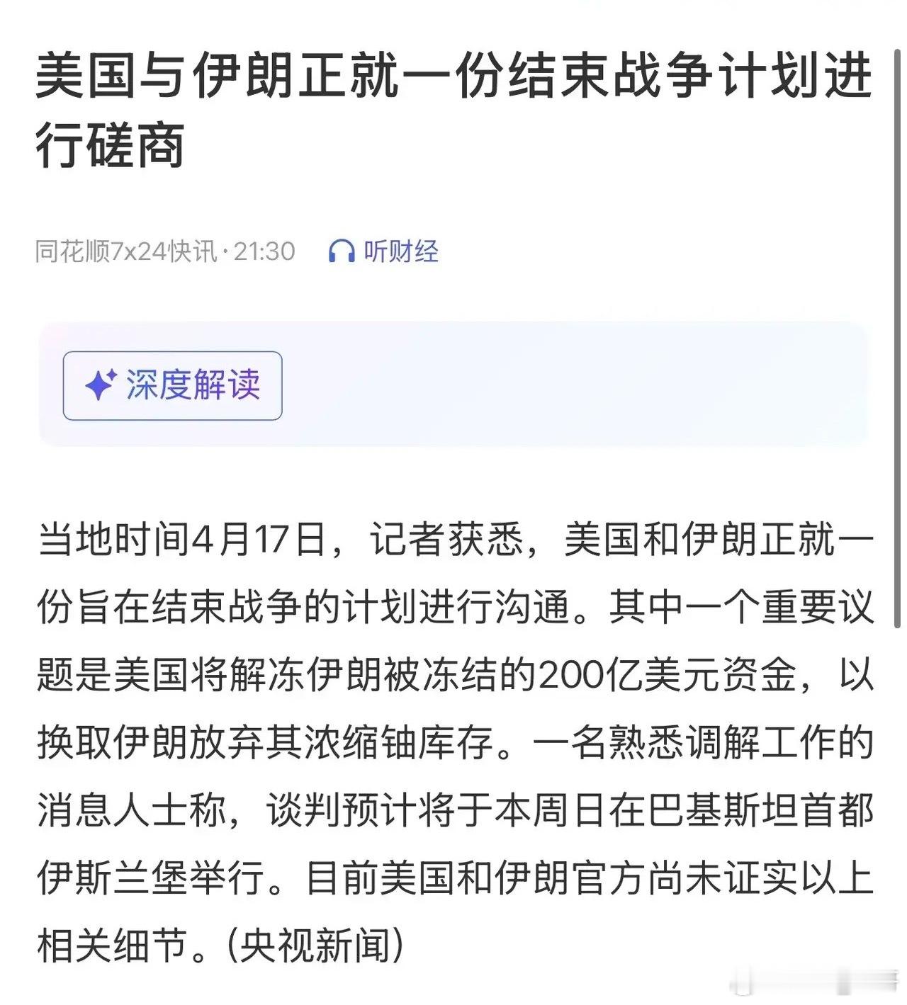 二是据消息称,美伊正磋商结束战争的计划;