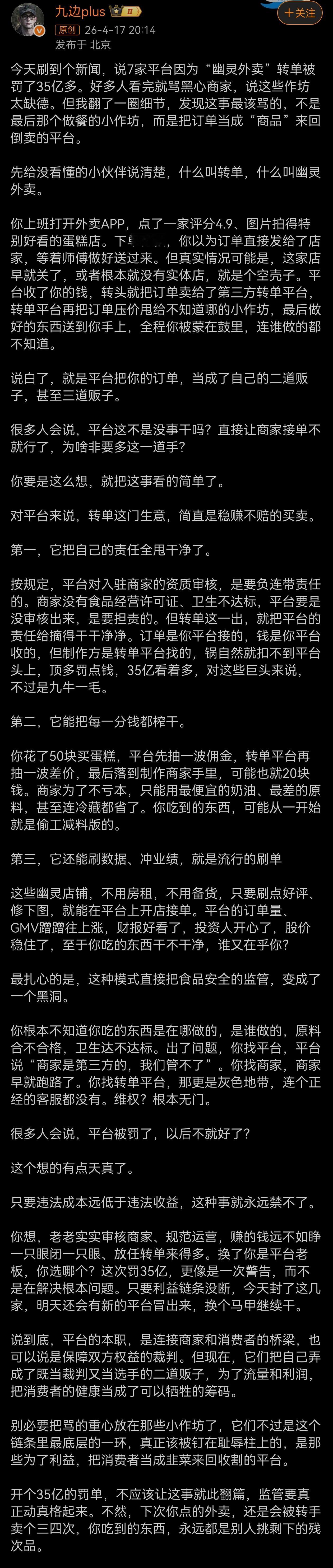所谓的“幽灵外卖”乱象,核心在于平台将订单作为商品倒卖牟利。消费者点的高分店铺实为无资质空壳,平台收款后转包给小作坊,层层抽佣导致餐品偷工减料。平台借此逃避审核责任、刷高业绩,而消费者维权无门。