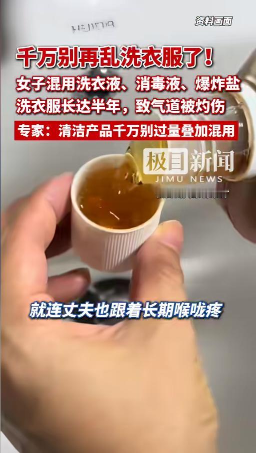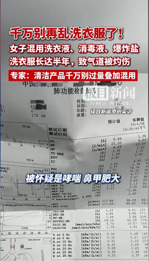 原来,她洗衣服的时候,有个坏习惯,喜欢把洗衣液、滴露消毒液、爆炸盐、还有爆香珠,一股脑倒在一起用,关键是,用量还特别的大。结果这几种东西起了化学反应,造成了她慢性化学中毒,最终气管被灼伤。