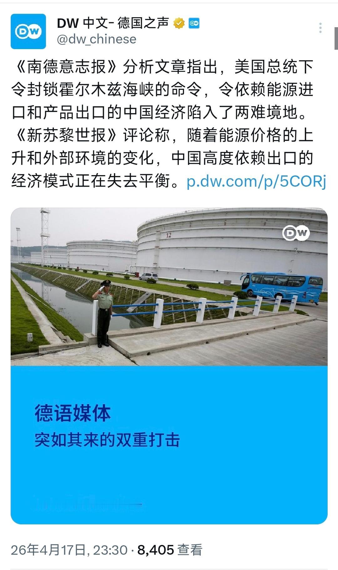 德国之声4月17日晚写道:“《南德意志报》分析文章指出,美国总统下令封锁霍尔木兹海峡的命令,令依赖能源进口和产品出口的中国经济陷入了两难境地。《新苏黎世报》评论称,随着能源价格的上升和外部环境的变化,中国高度依赖出口的经济模式正在失去平衡。”