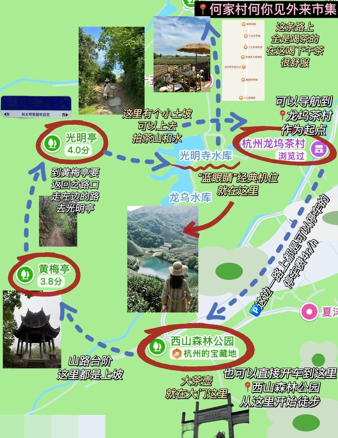 从龙坞茶村出发→西山森林公园(大茶壶雕塑)→黄梅亭→光明亭→光明寺水库→何家村市集→龙坞茶村