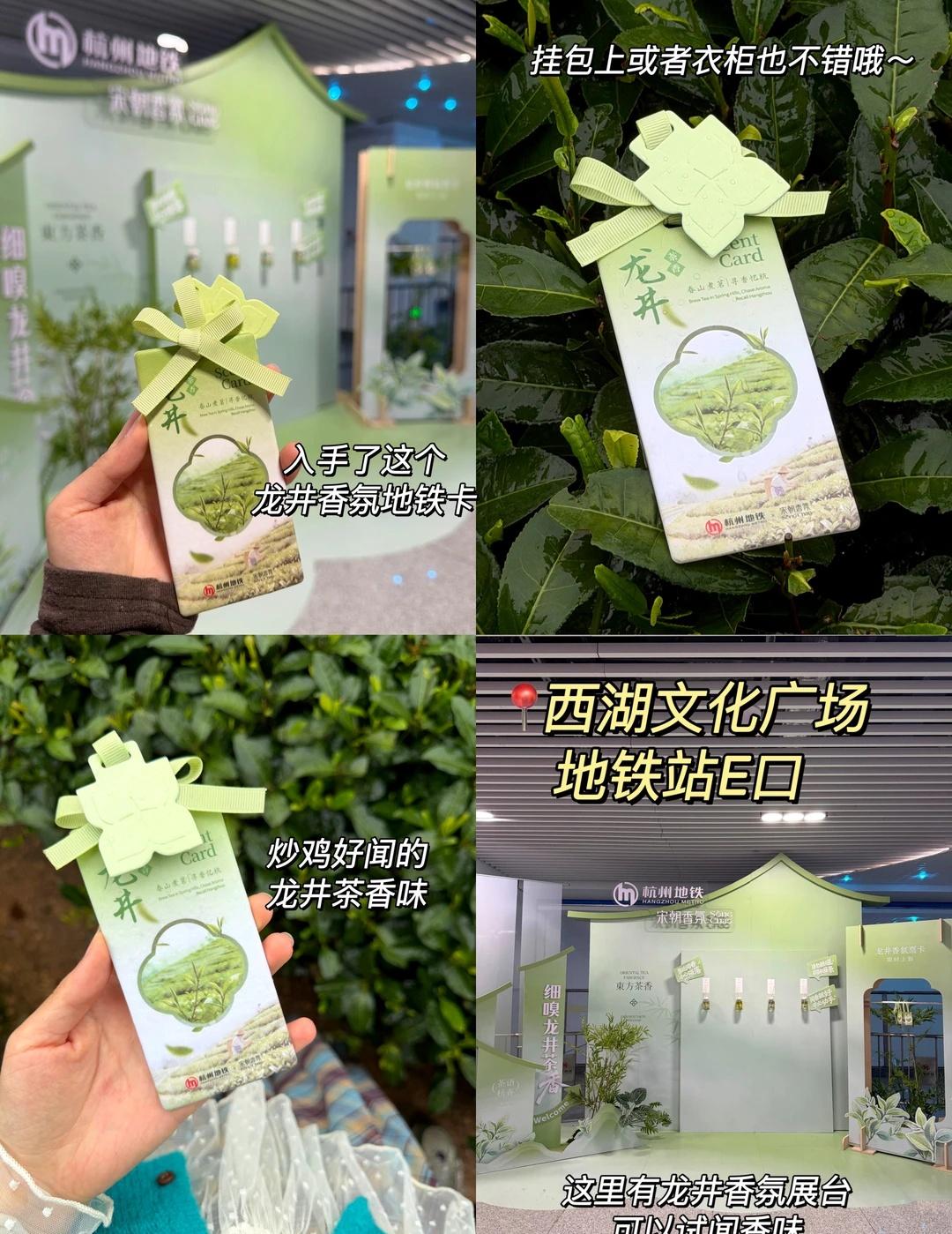 👉🏻经过西湖文化广场站(近E口)的时候看到这个✨【宋朝香氛×杭州地铁】联合推出的龙井香氛地铁卡试香展台,闻了一下真的很自然的龙井香,🌱就和茶山上自然怡人的空气一样清新,不仅可以刷地铁还可以当包挂、车挂或者挂衣柜里,香味真的很持久!也很适合送给朋友当做旅游纪念品,很特别~