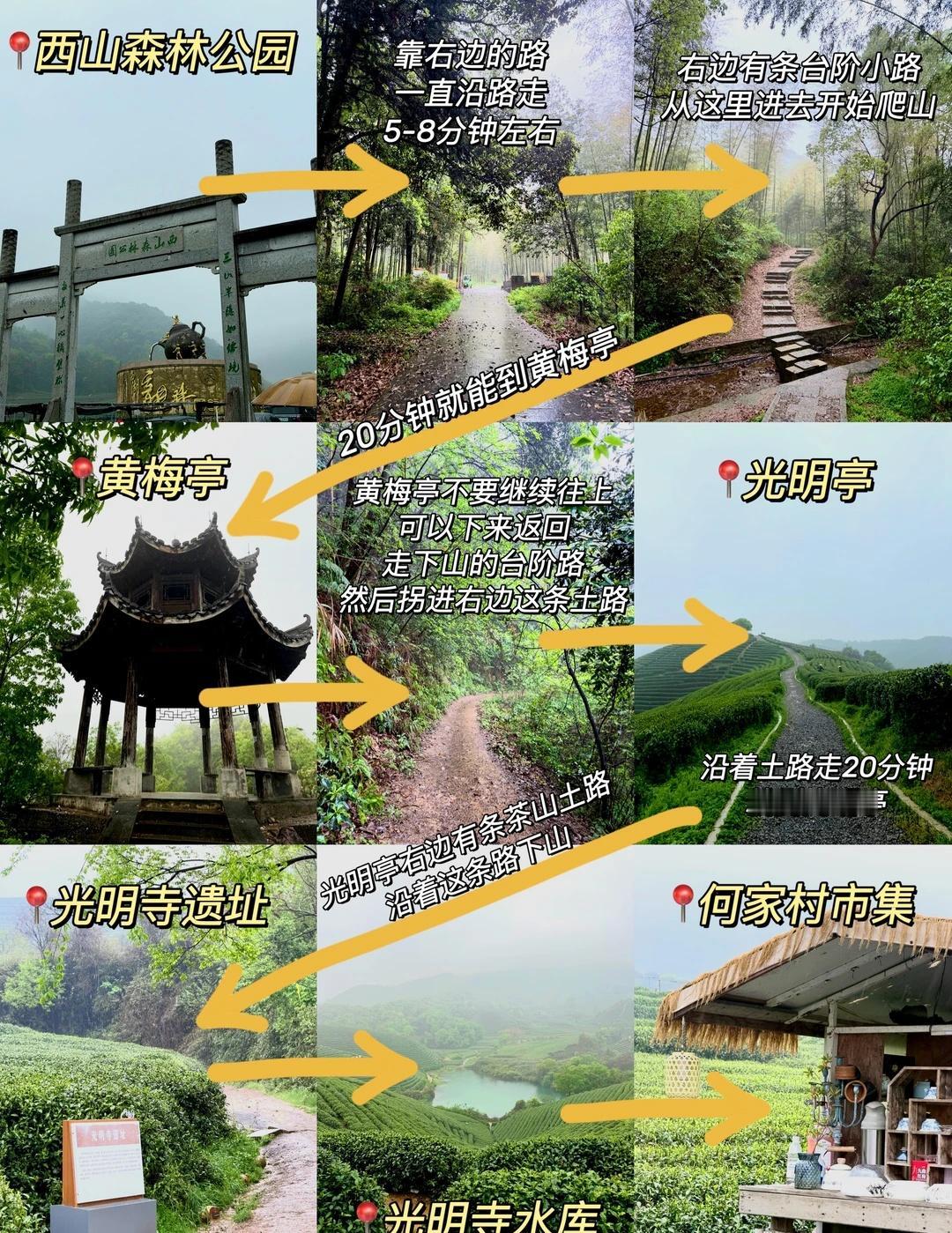 ⚠️西山森林公园到黄梅亭这一段是台阶爬山路段差不多要走20分钟,黄梅亭到光明亭这一段是土路,如果不想爬山只是想看看茶园茶山可以下面这条路线