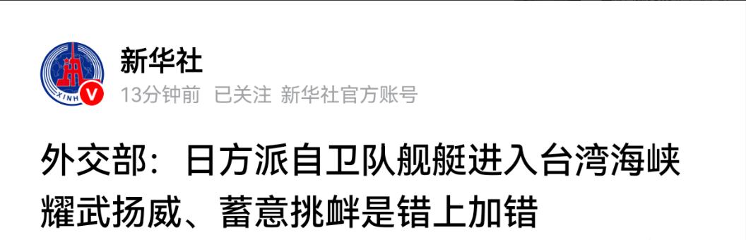 这些言论已经严重冲击了中日关系的政治基础,粗暴干涉了中国内政,而日方不仅至今不思悔改,反而直接把口头挑衅变成了实际行动,派战舰跑到台湾海峡兴风作浪,这就是典型的错上加错、一错再错。