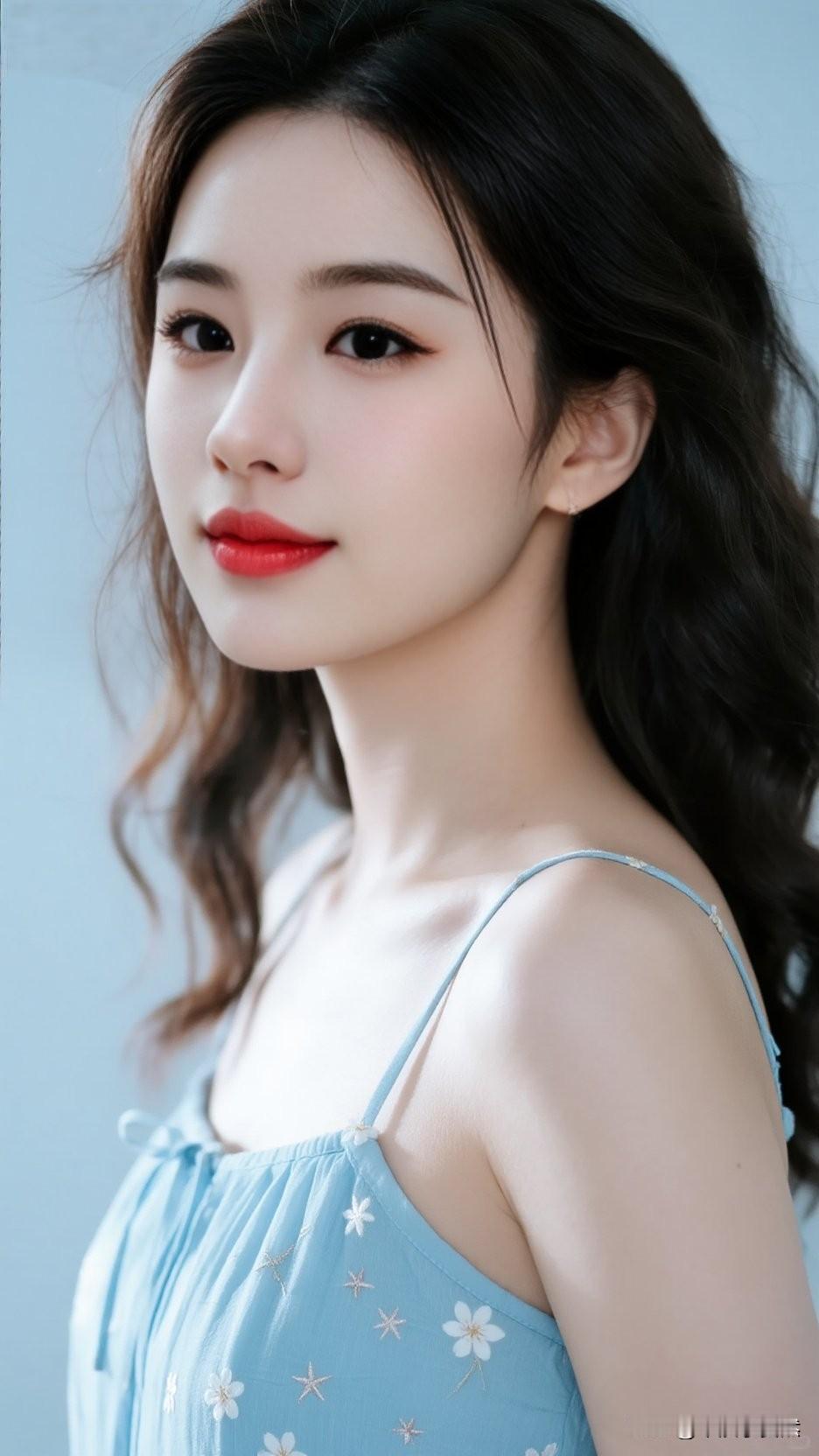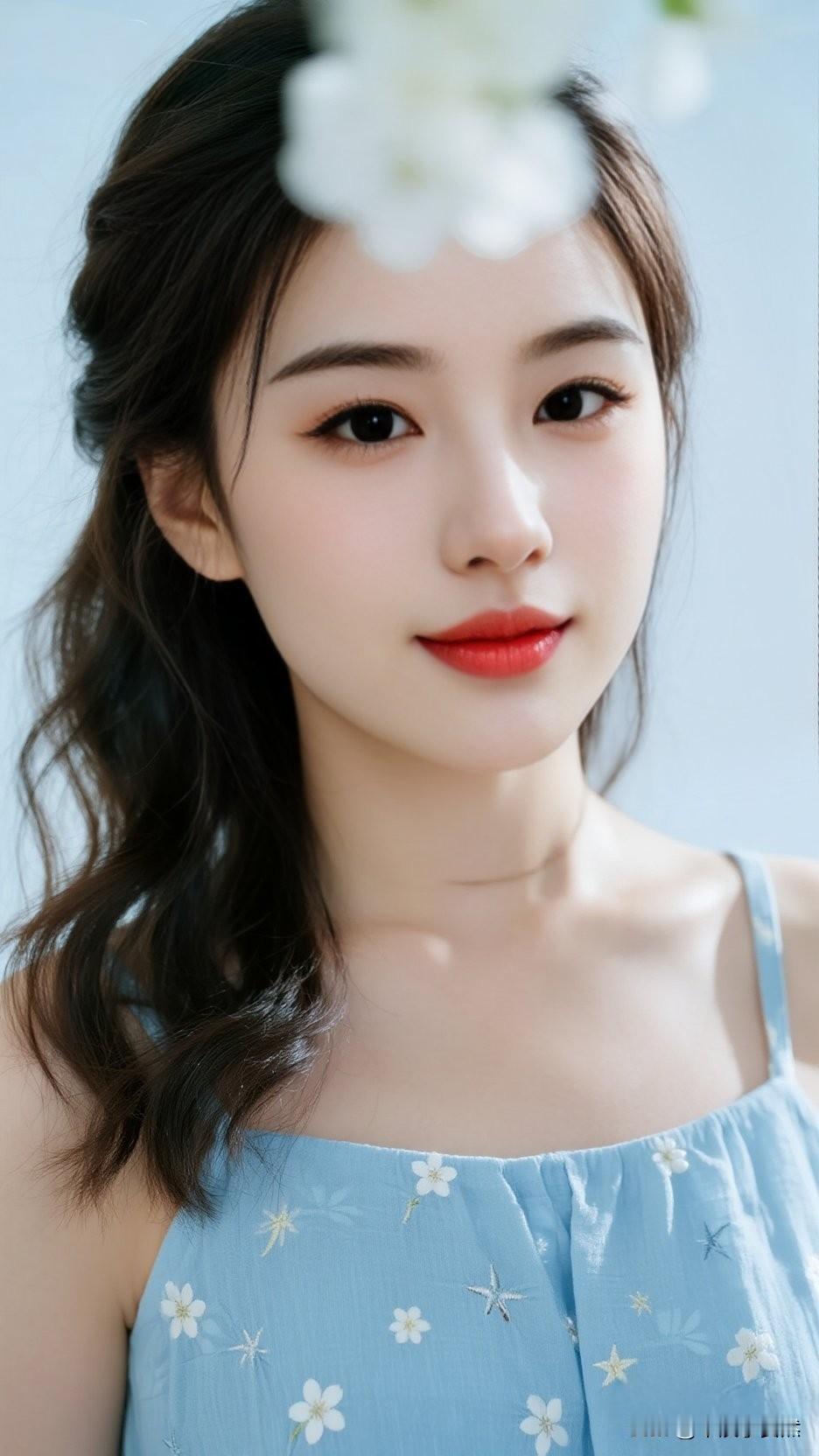 温柔蓝调,甜美少女,花海中的梦幻时光,碧空如洗,美人如画。温柔甜美少女