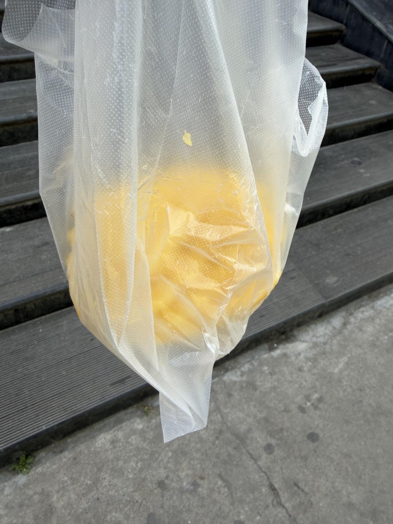 我先去第一家摊,看到女老板正在切一个削好皮的菠萝,把小块往塑料盒里装,就让她把还没切的半块卖给我。