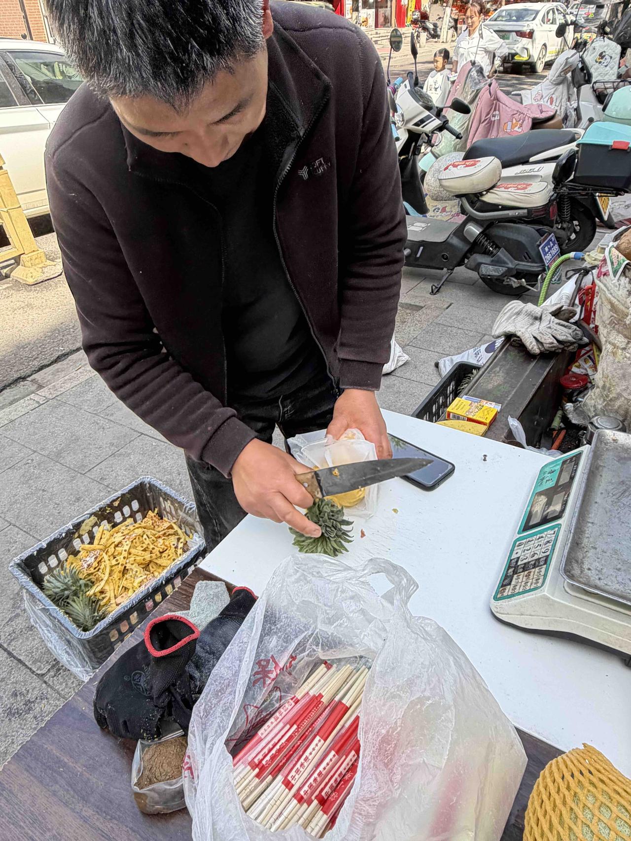 之前,我在其它摊上,买过切好放在玻璃盒里的菠萝,又干又硬,回家炒肉不好吃!