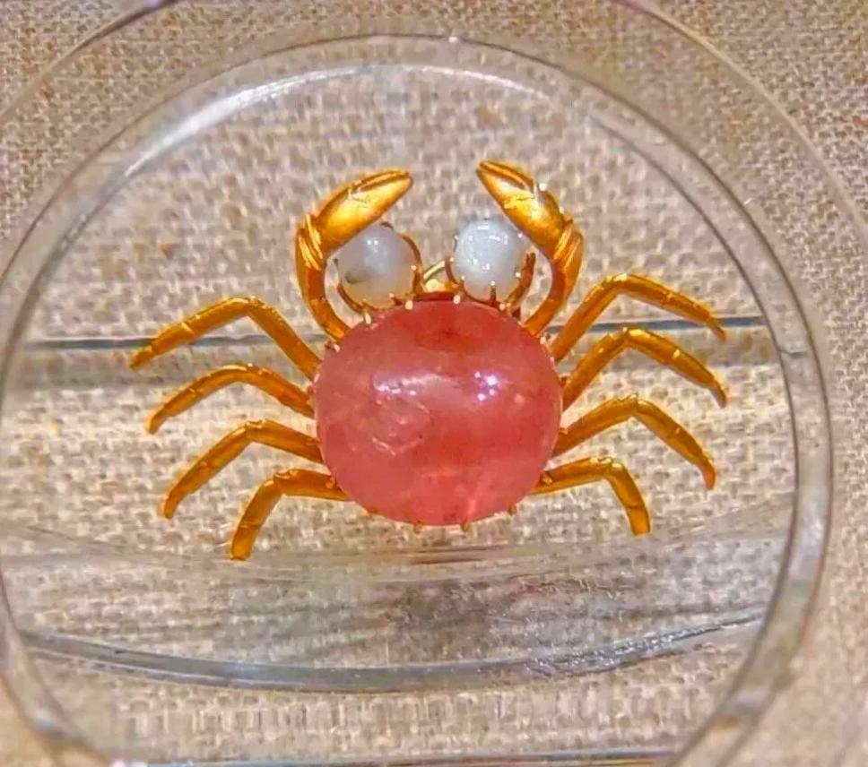 它粉色的碧玺蟹身,黄金铸的八条腿和两只大钳子,白玉雕的眼睛温润有光。
