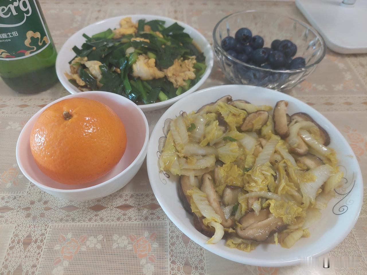 用寿光韭菜炒了一个鹅蛋,冰箱剩下的白菜芯炒香菇,加的烧烤料炒的。