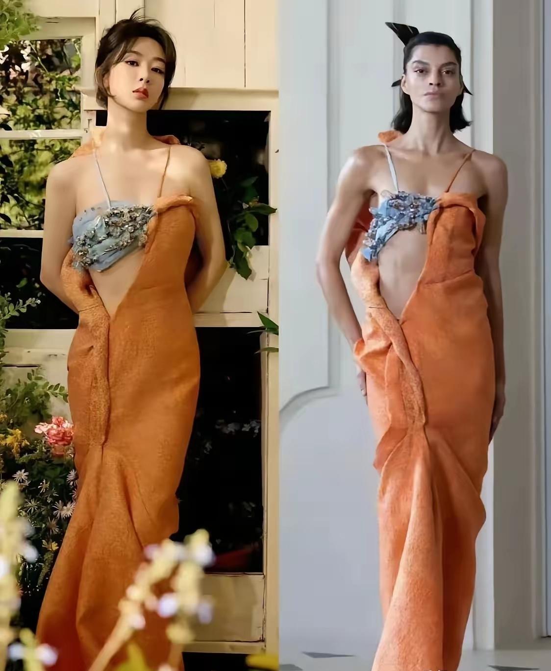 高定礼服最怕“人被衣服穿”,但杨紫的盘发、清透的妆容和整体的气质,和这件橘色礼服的适配度太高了。她把设计的“艺术感”和自身的“灵气”完美融合,穿出了属于自己的味道,比原版多了几分温柔的张力。