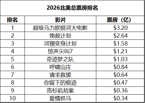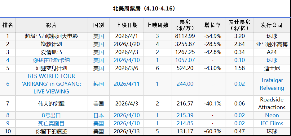 2026年第15周北美票房 :1.《超级马力欧银河大电影》蝉联冠军,累计票房3.2亿美元,全球票房突破6.41亿超越《飞驰人生3》成为年度冠军;2.《挽救计划》全球票房5.33亿美元,走势稳健;3.《你我在托斯卡纳》在新片中表现最佳。(数据:boxofficemojo)