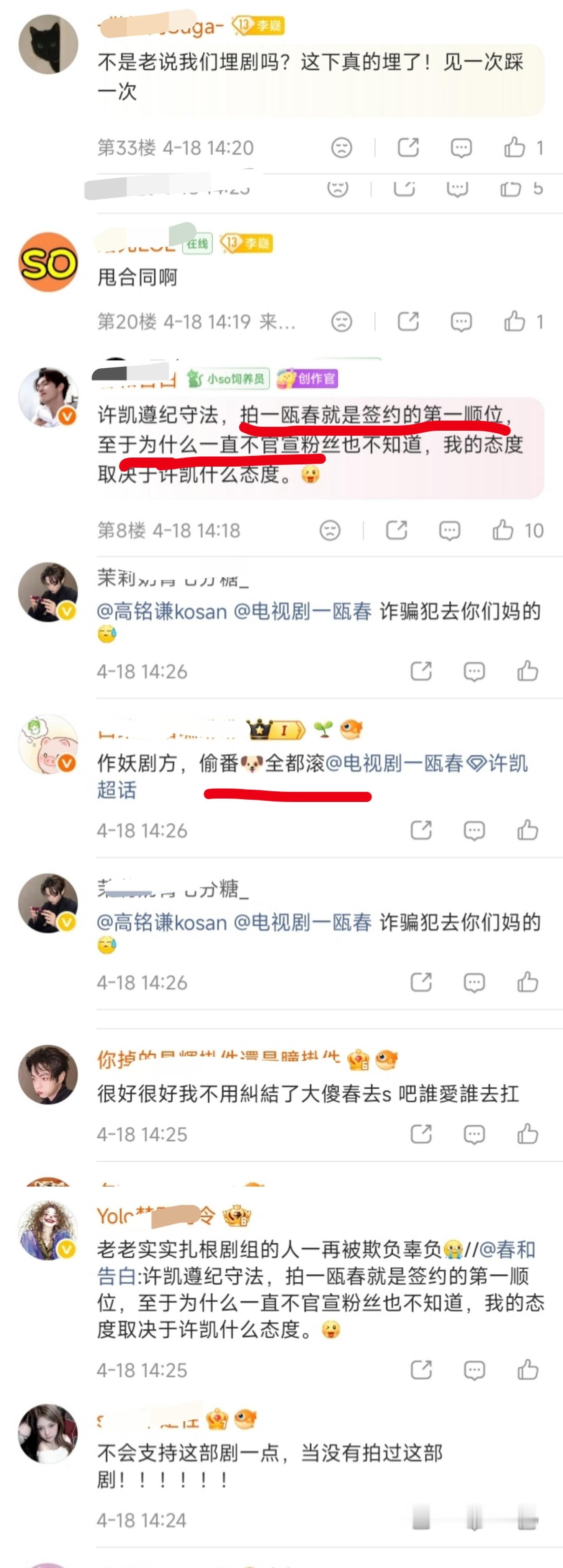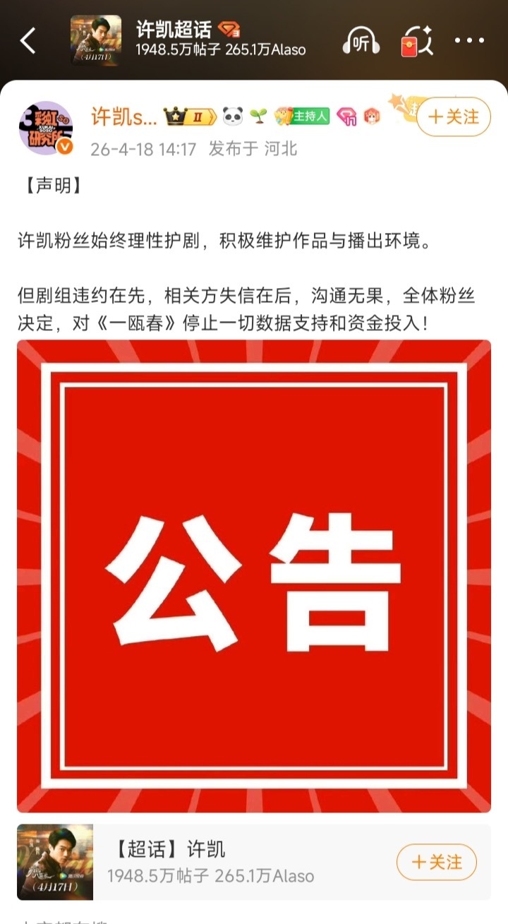 因为疑是《一瓯春》剧组违约,许凯粉丝维权,停止对剧的做📊和💰支持。