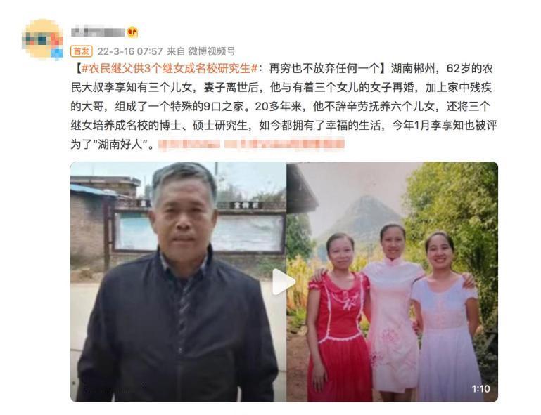 2022年,李享知获评“湖南好人”,面对这份荣誉,这位朴实的老农没有华丽的言辞,依旧是那句简单的话:“她们喊我一声爹,我就得负责到底。”