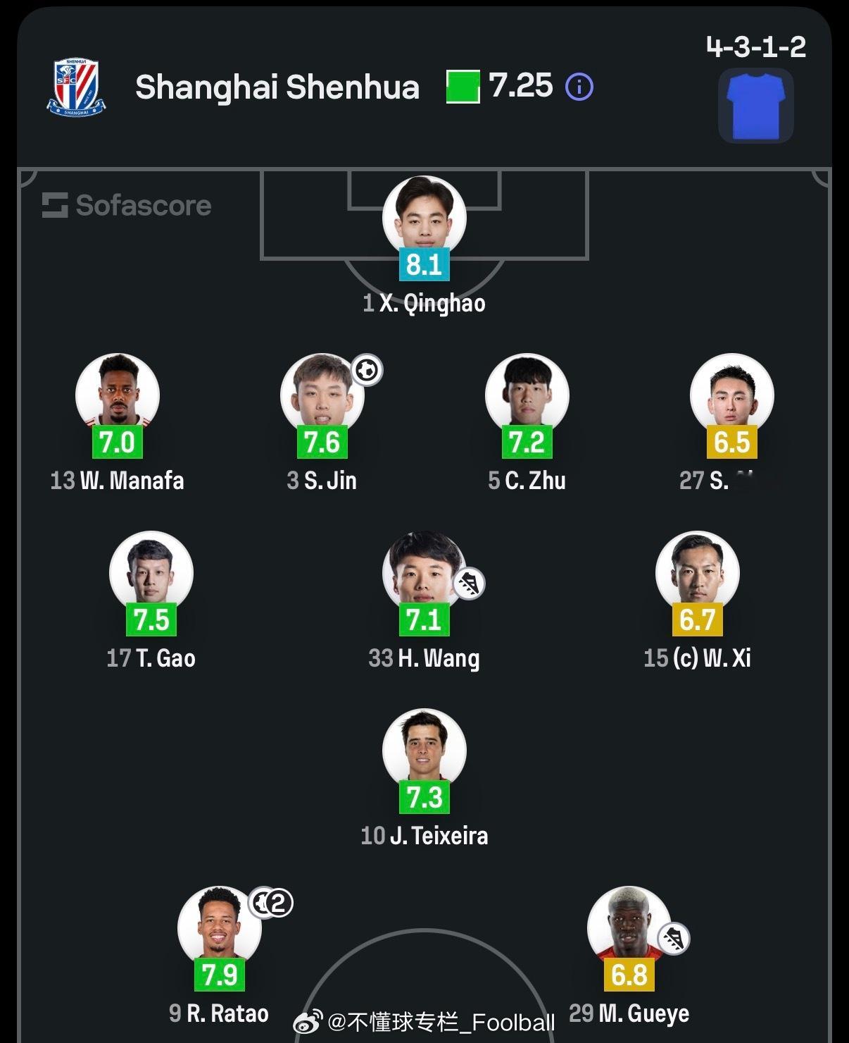 半场最高评分:庆帝上海申花中超联赛上海申花vs辽宁铁人 上海·上海体育场