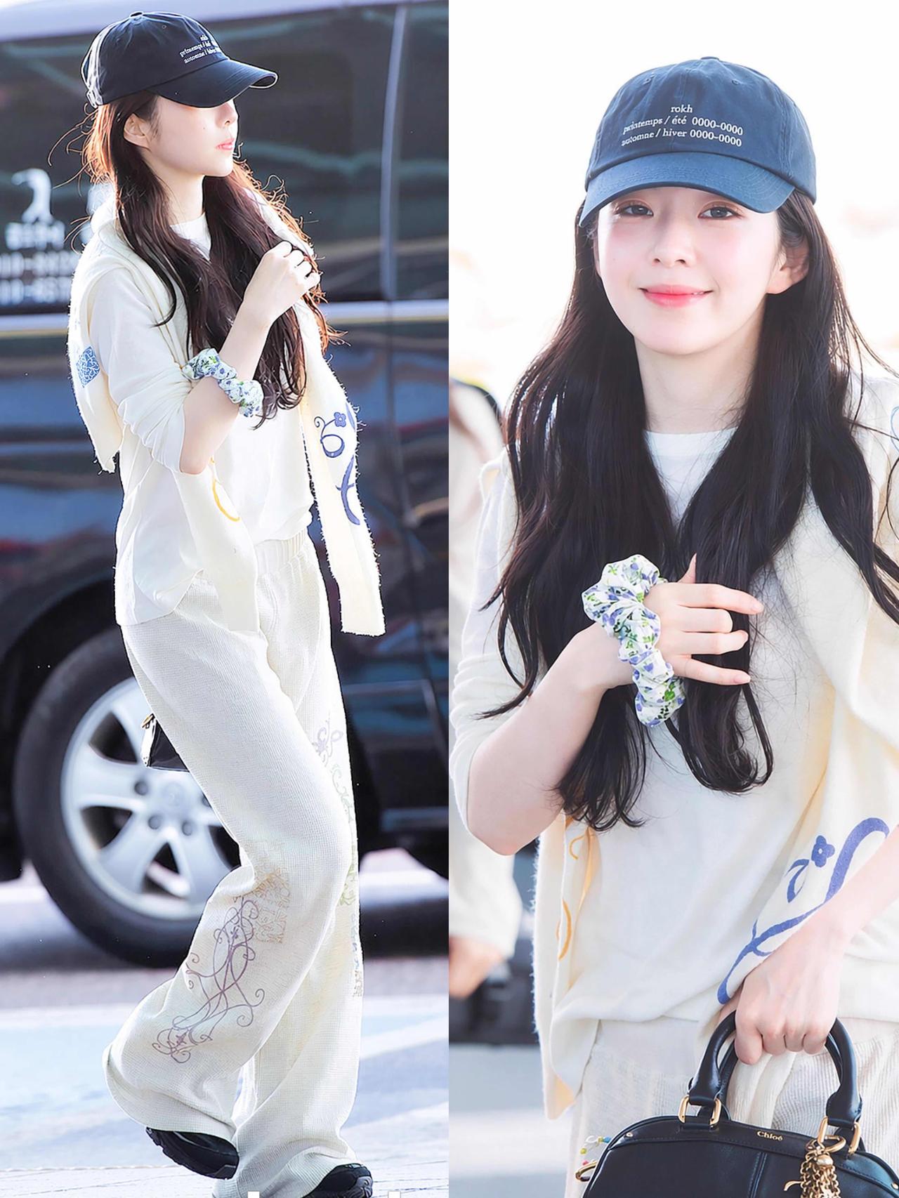 一身奶白系休闲套装软乎乎的,华夫格面料自带松弛质感,垂坠阔腿裤又悄悄拉长了身形线条。外搭同色系印花披肩,随性搭在肩头,搭配藏青棒球帽和黑包,用色彩和细节平衡了整体的温柔感,再加上碎花发圈点缀,把慵懒又精致的韩系氛围感拿捏得刚刚好。