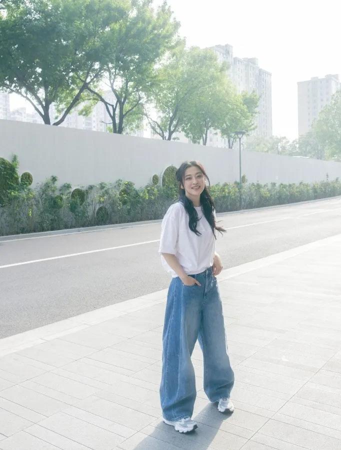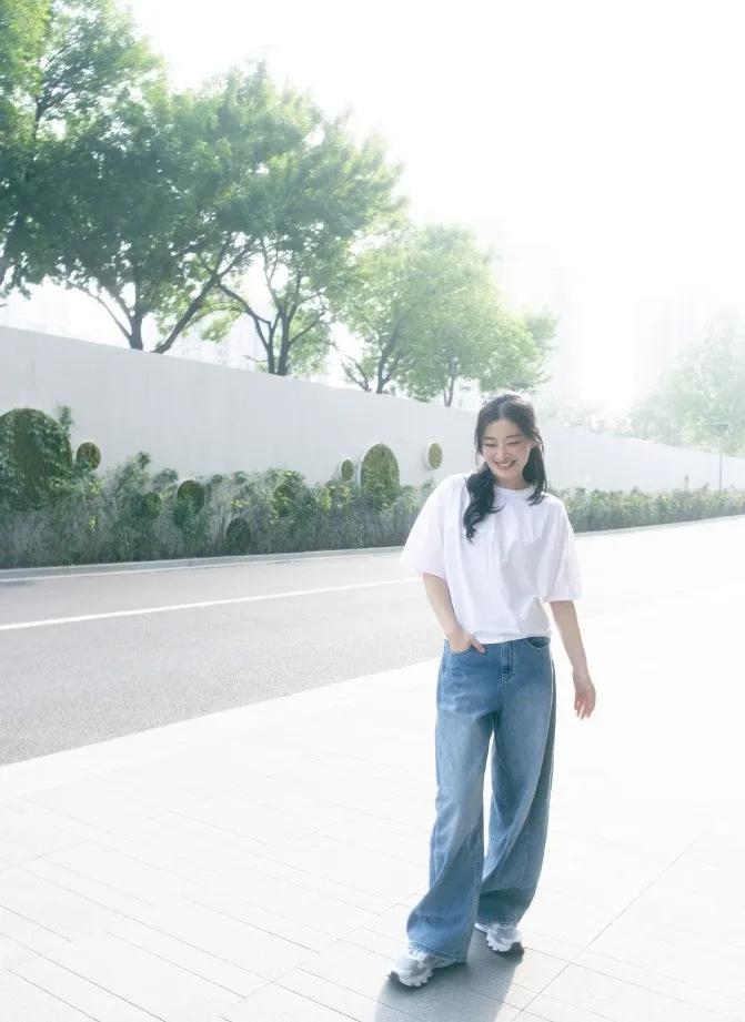 白T+牛仔阔腿裤的简约搭配,被梅婷穿出了松弛感天花板。