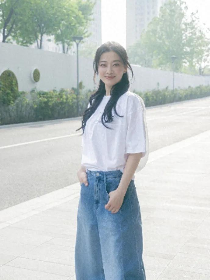 50岁这状态真的绝了!💯 白T+牛仔阔腿裤的简约搭配,被梅婷穿出了松弛感天花板