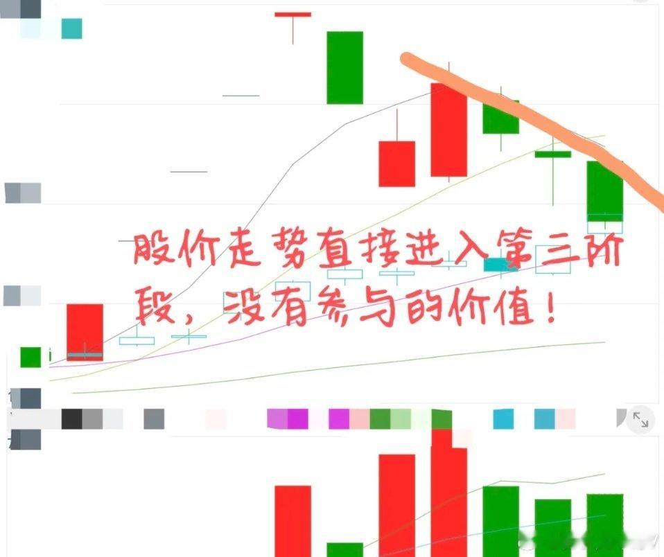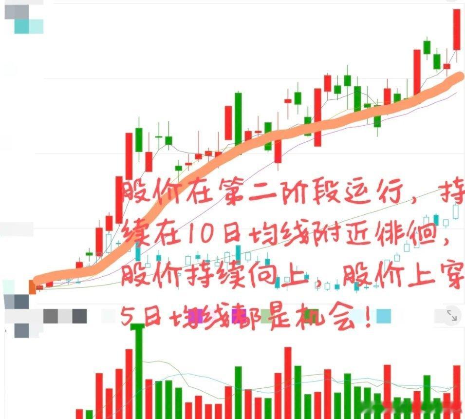 股价上涨运行的三个阶段。第一个,强势阶段。股价沿着5日均线上行。第二个,反攻阶段。股价跌破5日线后沿着10日线往上。第三个,退潮阶段。股价经历了前两阶段运行后,股价被5日均线和10日均线压制后开始退潮向下运行,也就预示着股价进入下跌周期。可以赚取较大利润的只有第一和第二个阶段。当一只股票的股价沿着5日均线走,这个期间都是可以博弈上涨的,如果,在这个阶段都不能赚,其他的位置想要赚钱也是很困难的。5日均线上的操作就是,5日线上买入和上穿5日线上买入,股价走弱就卖出,如果等到跌破5日线再卖出,基本上也就赚不到什么钱了。同样的,股价就算跌破了5日线,但是股价持续在10日线附近徘徊,那么,股价上穿5日线就是合适的介入点位,等待股价走出第二阶段的走势,如果股价已经走入第三阶段,基本上就没有参与的价值了。