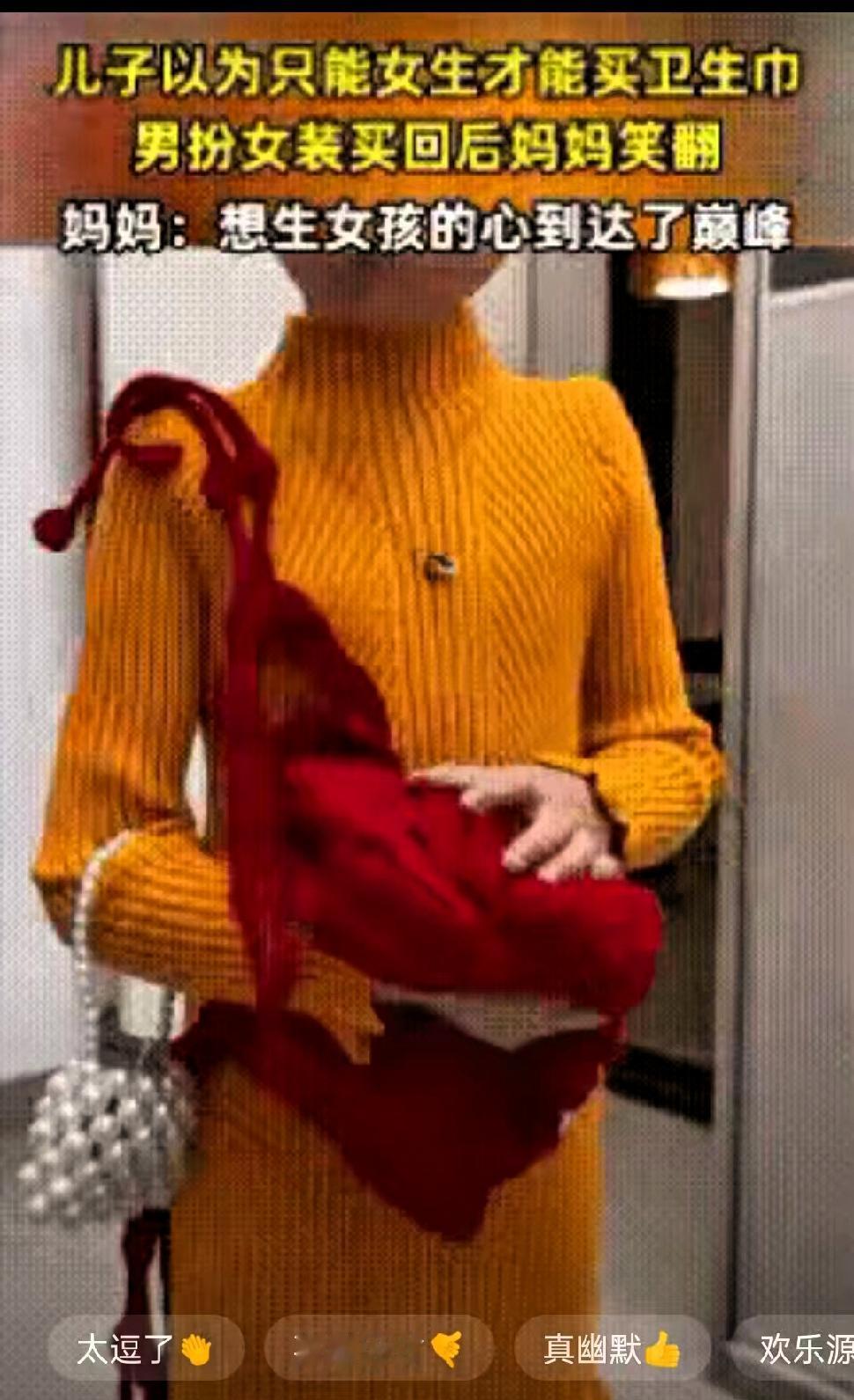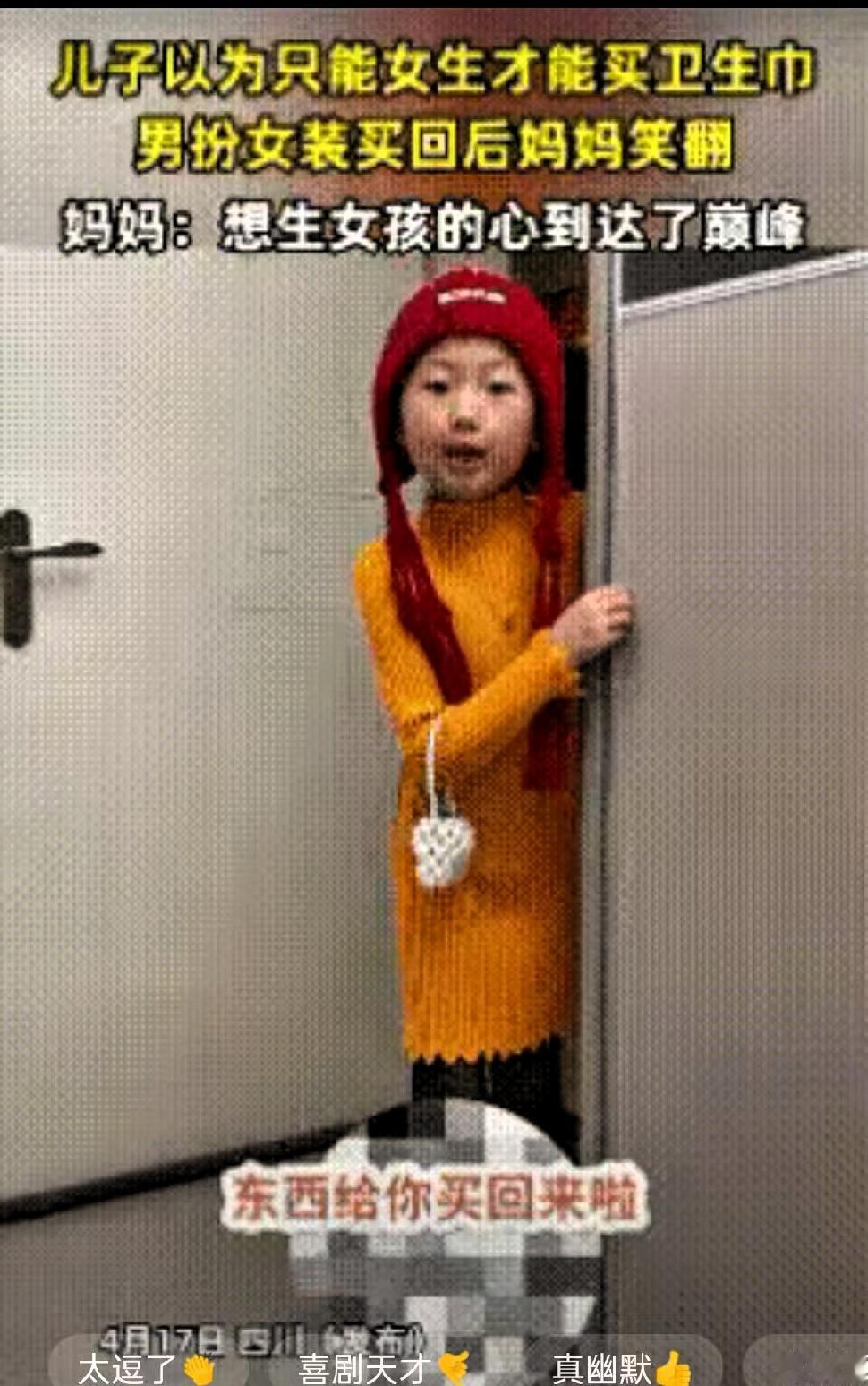 简直了!”女子来大姨妈,家里却没有卫生巾了,她让儿子去给自己买一包回来,儿子以为卫生巾只卖给女性,没有多想,便想着帮妈妈解决眼前的难题。