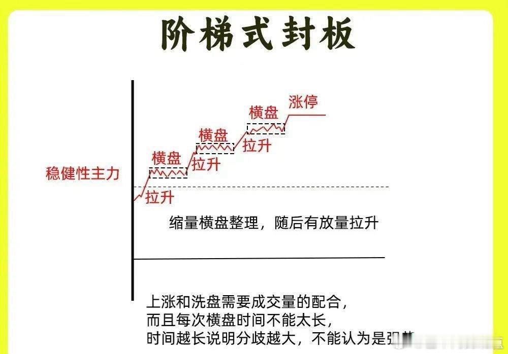 这是主力边拉边洗的一个过程,股价先是拉升一段,成交量放量,随后开始横盘,成交量开始缩量,又出现放量拉升,再次横盘,直到股价出现涨停。整个走势就像向上的楼梯。走势很稳,筹码得到充分换手。