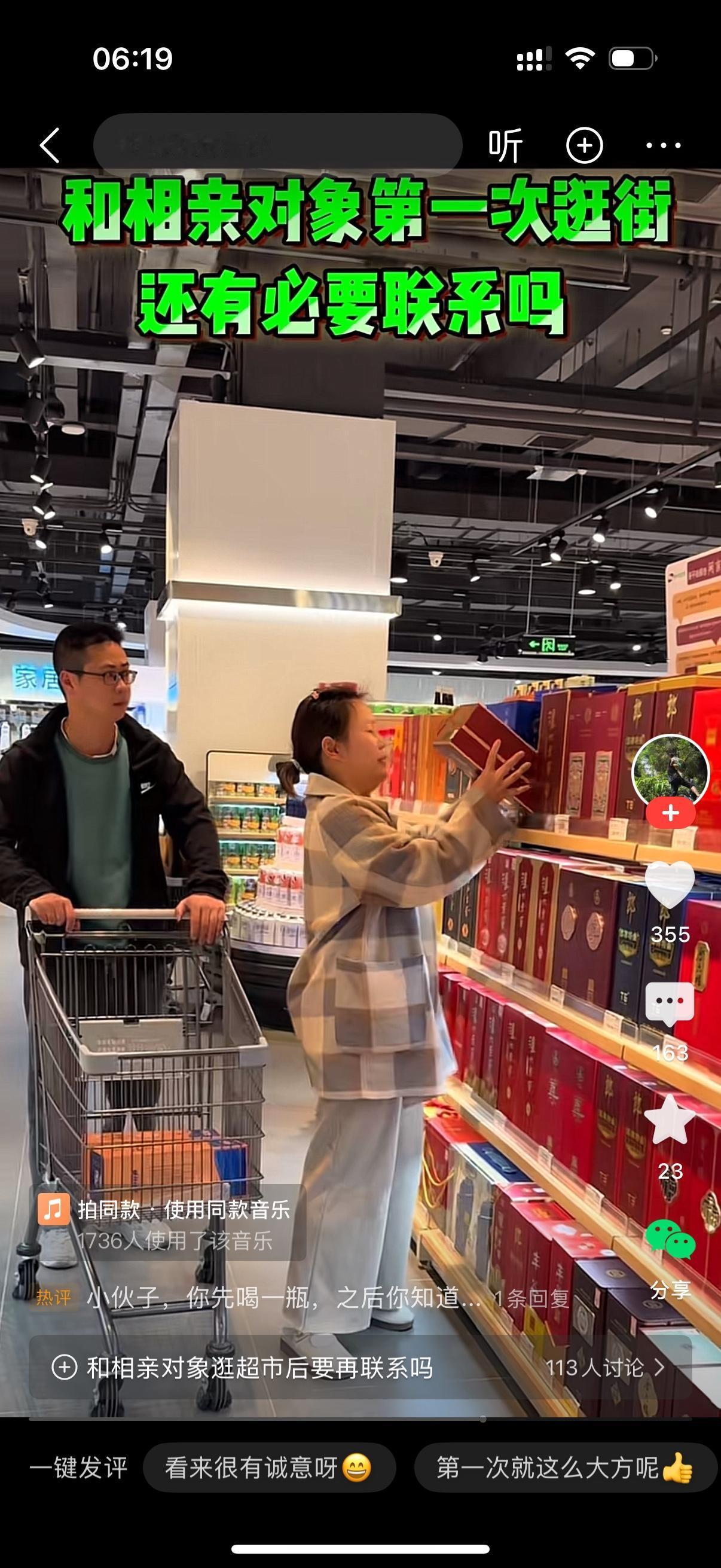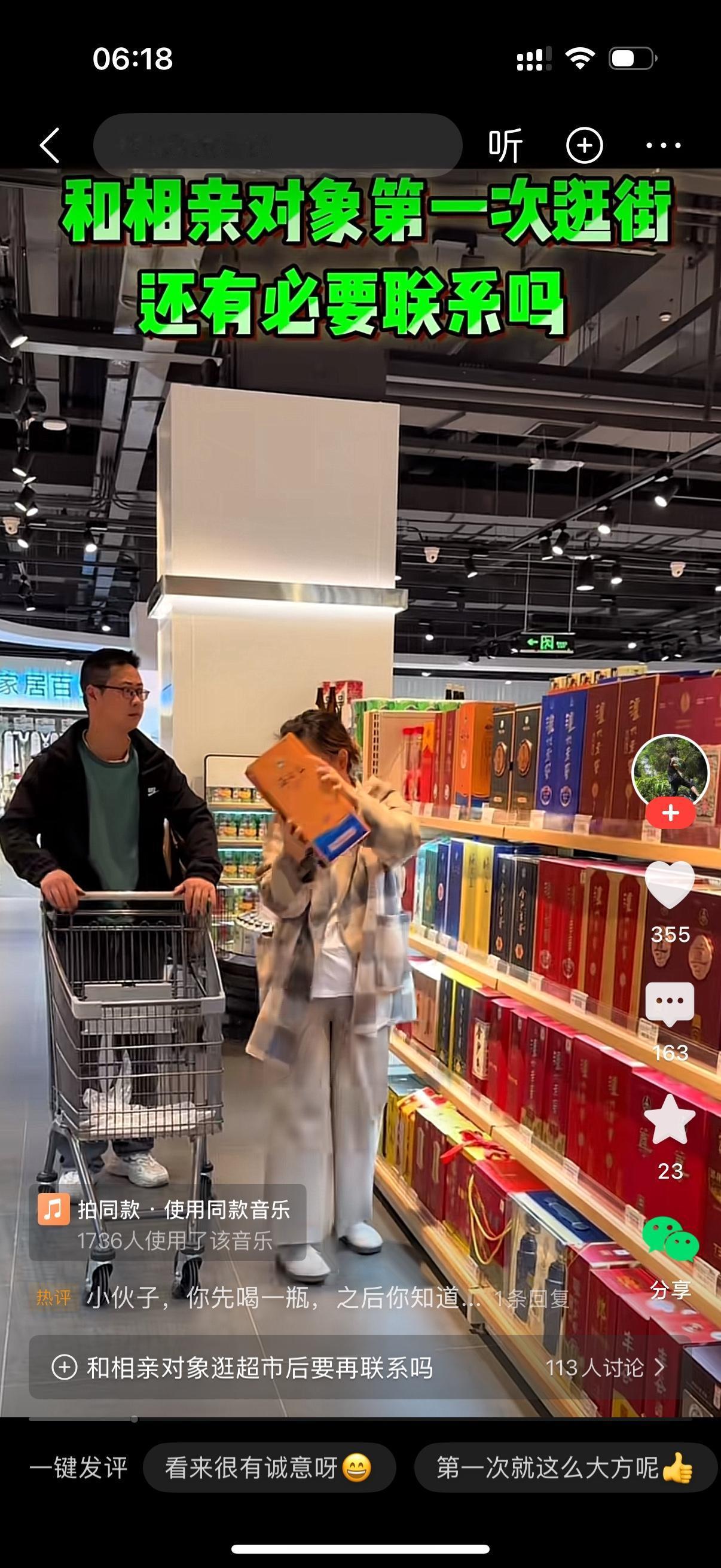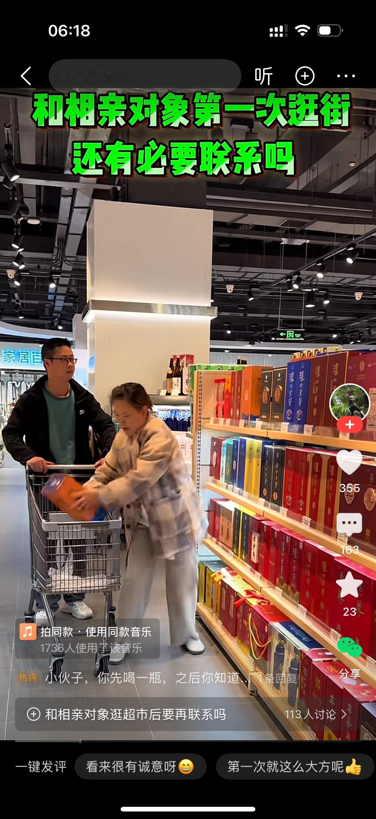 男人和相亲对象第一次逛街。他们走到超市的酒柜前。女人拿了一瓶酒,给我爸的。女人又