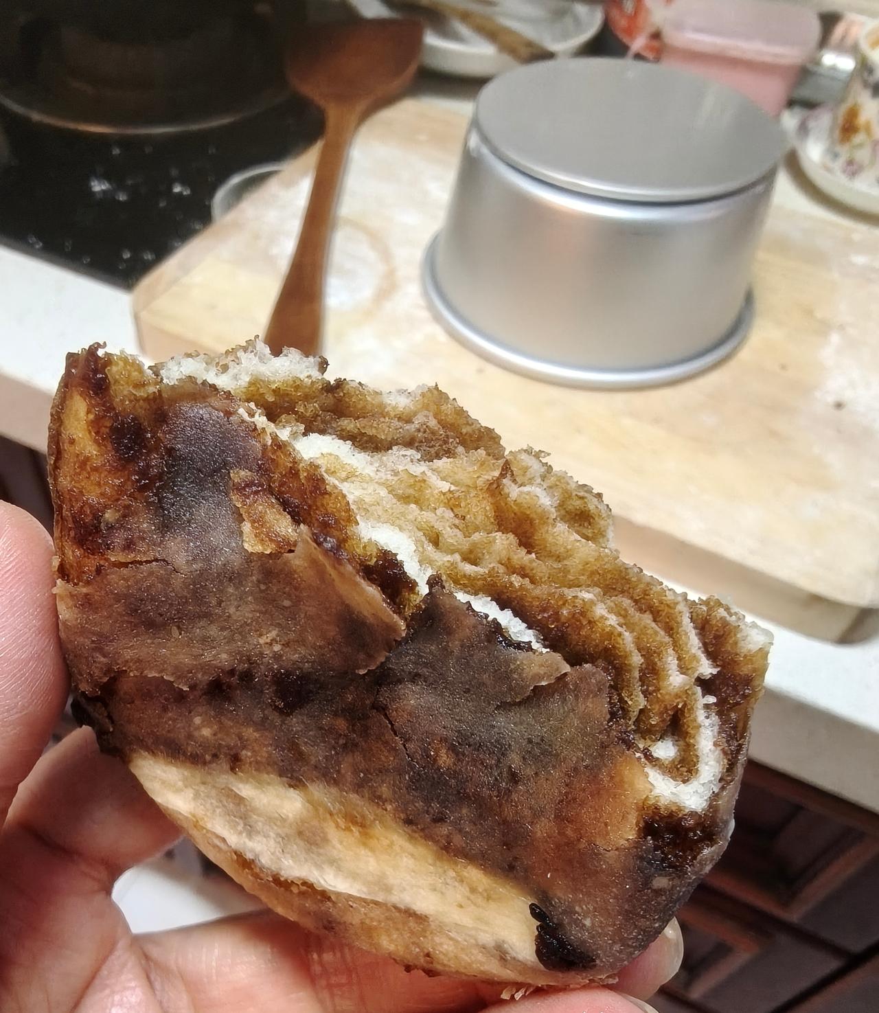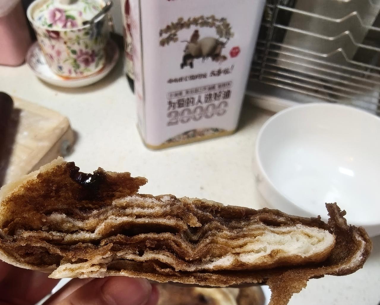 去内蒙旅游当地的红糖焙子特别好吃,昨天心血来潮自己动手做了一下,我是跟网上学的,先和点发面,又用红糖面粉和稻米油做了红糖馅,然后像包包子一样包好,擀成牛舌饼,再折叠擀开,重复两次,醒发一二十分钟然后再烤,但是烤出来跟内蒙吃的口感不一样,没有那么煊软也没有那么油润,表皮还有点干,不知道是不是因为我刷的是稻米油,没用胡麻油的缘故,还是其他原因,正宗的红糖焙子应该怎么做?