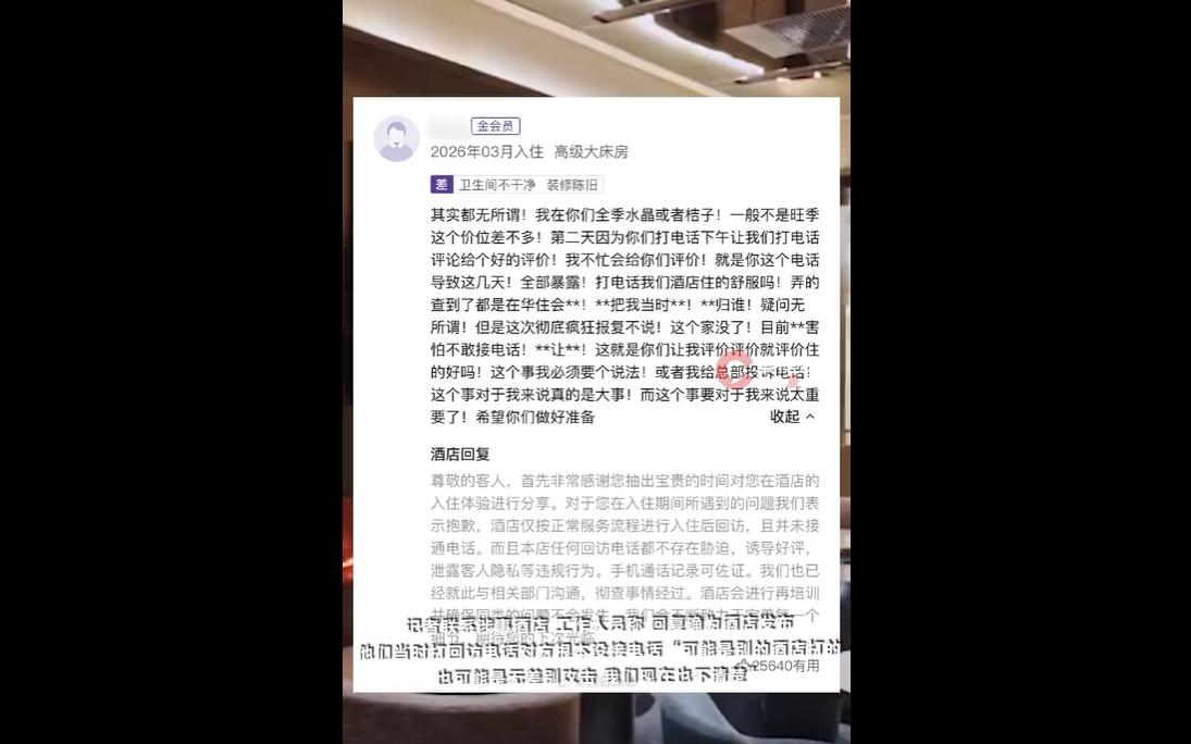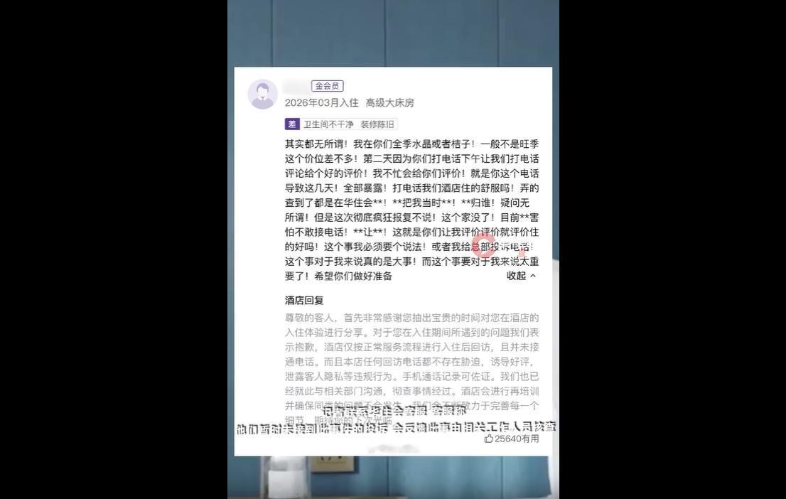 2026年4月,山西大同董姓女子(在平台发布差评,控诉某酒店的回访电话,暴露其3月的开房行程,导致丈夫发现其婚外情后提出离婚、家庭破裂,还要求酒店承担责任。