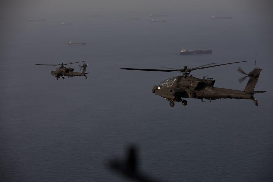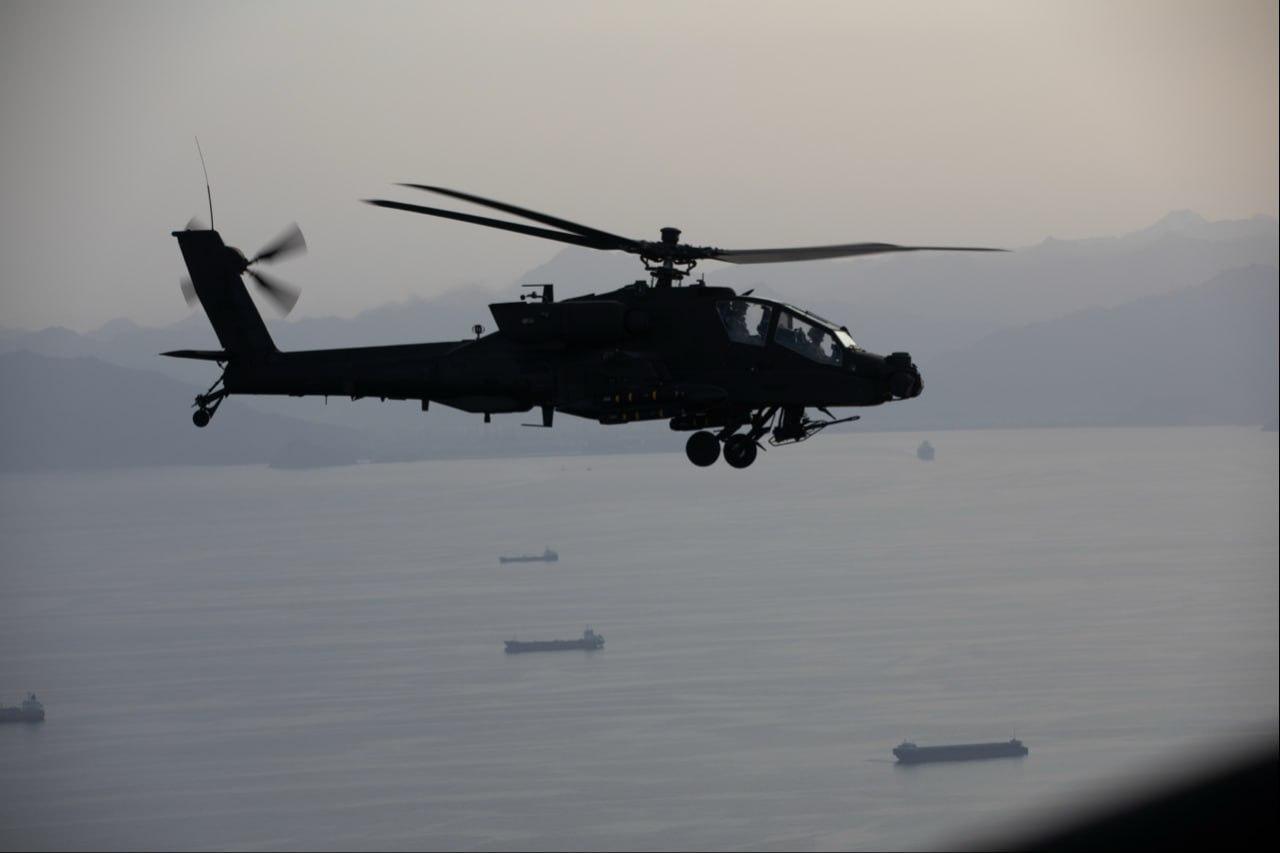 昨日,美国AH-64“阿帕奇”直升机在霍尔木兹海峡上空巡逻。