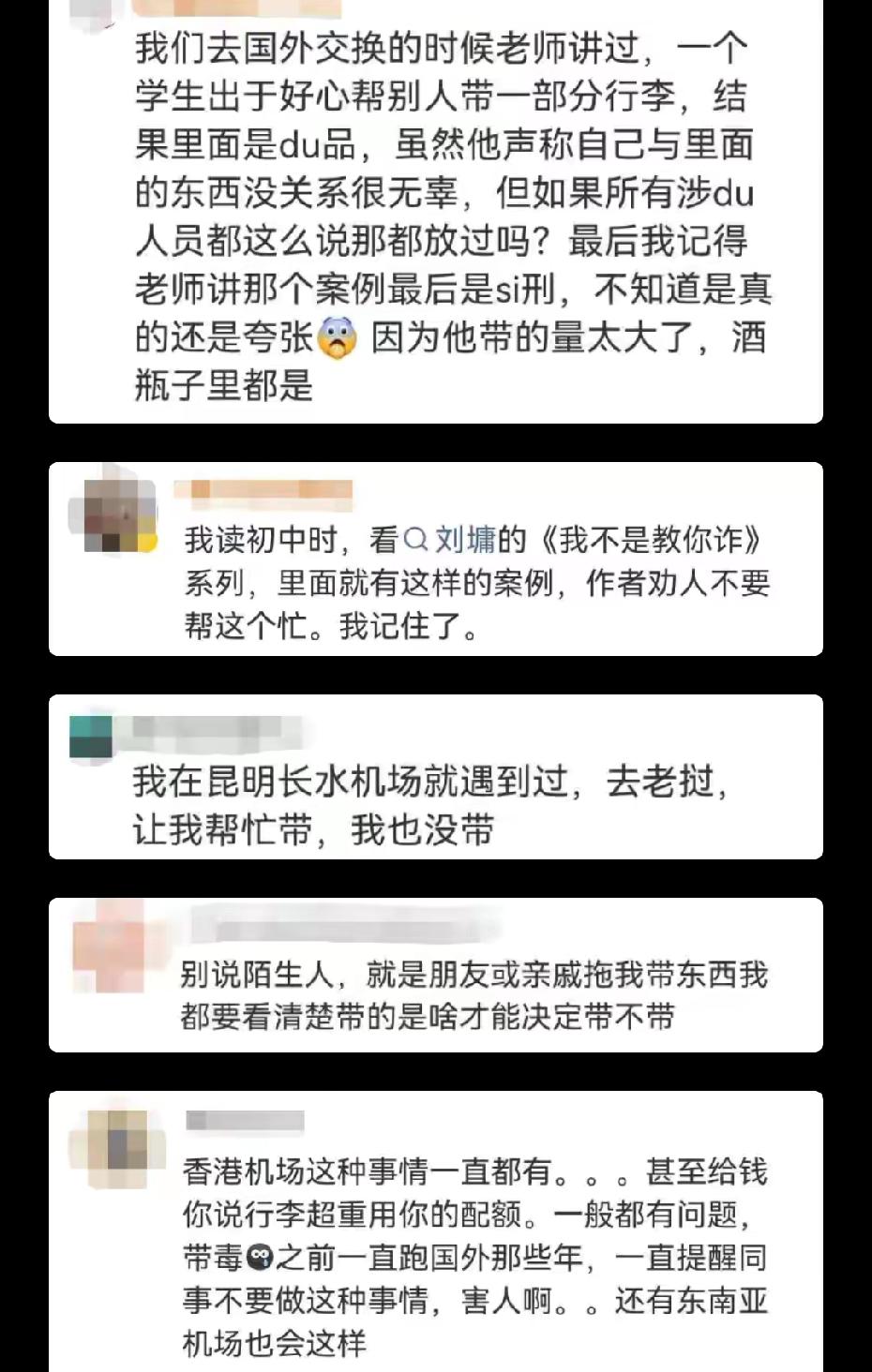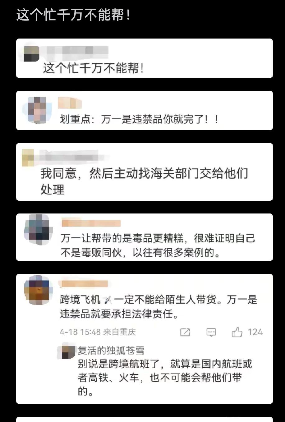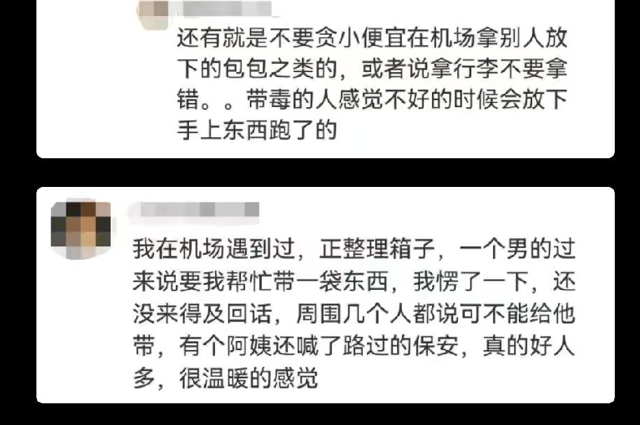 千万不能帮,吴女士上海飞香港,机场遇见一个20多岁的女生要求帮忙带行李箱,说叔叔也是这个航班。吴女士说必须让她叔叔和自己已通过安检。女生找各种理由搪塞。吴女士拒绝了女生以后,在过安检的时候,发现了又一名女生在用同样的套路,让人帮她带行李。遇见这种情况要警惕,千万不能帮,否则有什么问题就说不清楚了。