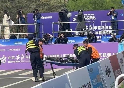 宇树H1机器人半马赛场终点累倒 4月19日,据《科创板日报》,记者现场获悉,4月19日,2026北京亦庄人形机器人半程马拉松终点,备受关注的宇树H1机器人在赛道上突发姿态失控,摇摇晃晃失去平衡摔倒。现场工作人员立即启动应急方案,用担架将其抬离赛道。这台H1此前排位赛中曾跑出亮眼成绩,被视作热门选手。