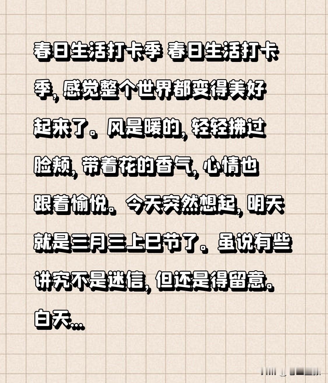 今天突然想起,明天就是三月三上巳节了。虽说有些讲究不是迷信,但还是得留意。白天有3个禁忌,晚上有2个注意事项,得赶紧告诉家人。