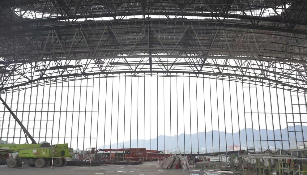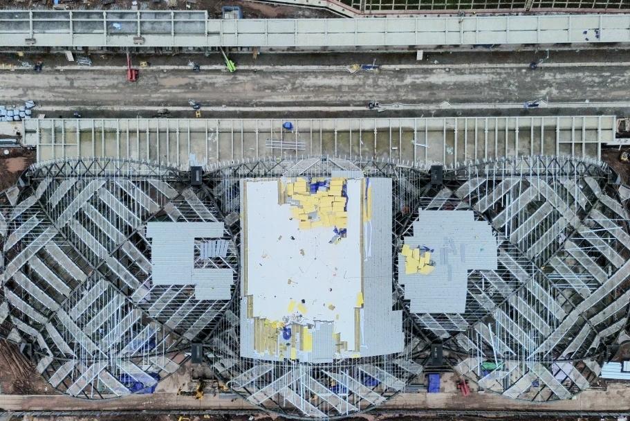 位于大足区宝顶镇的大足石刻站,是成渝中线高铁上极具地域文化特色的关键站点,站场规模2台4线,站房以“石刻传承、雕琢未来”为设计主题,深度融合大足石窟造像线条、浮雕肌理等文化元素,建成后将成为集交通枢纽、文化展示、城市赋能于一体的现代化城市门户。目前该站房钢结构工程已全面完工,此次完工的钢结构体系涵盖候车厅钢网架屋盖、进站厅钢框架屋盖,施工中采用整体顶升、同步控制、就位拼装成型的先进工序,实现了高空作业的安全高效与精准可控,为后续屋面施工、幕墙安装、装饰装修及机电设备安装全面铺开奠定了坚实基础。