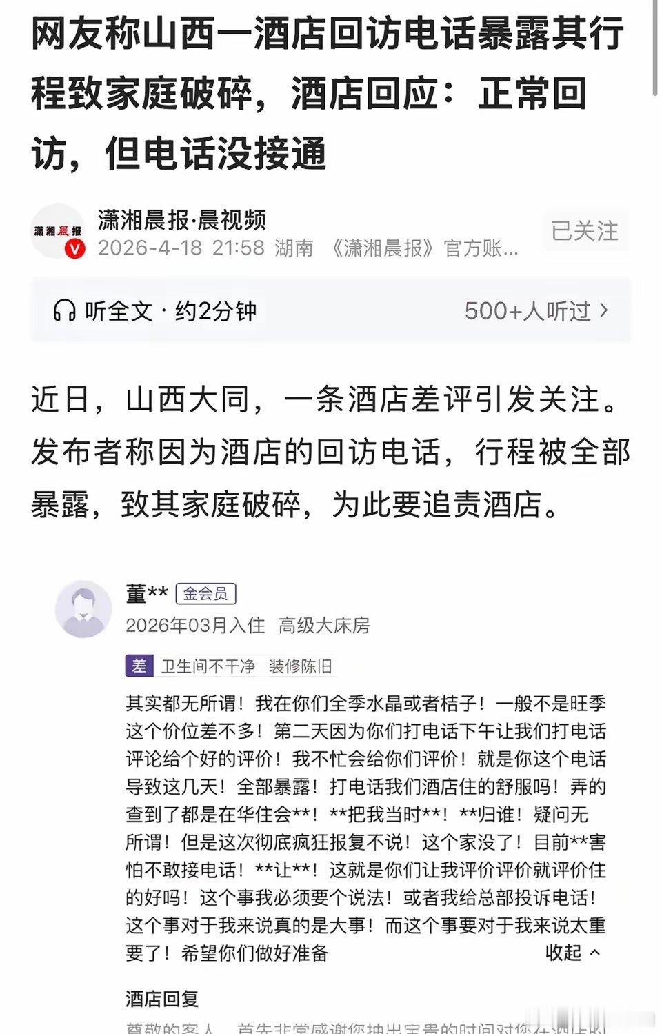 山西大同,女子和情人去酒店开房,第二天,酒店给女子打回访电话,让女子给好评。谁知,竟被其丈夫知道了。丈夫暴怒,直接和女子离婚,孩子也不给她,女子傻眼了。回过味后,女子不反省自己,却把锅甩给酒店,认为酒店导致她的行踪暴露,家都散了,要求酒店负责。酒店喊冤:正常回访电话,电话根本没打通。2026年3月的一天,董女士瞒着丈夫,与情人入住了桔子水晶酒店。她本以为这件事做得神不知鬼不觉,和情人厮守几日,以解相思之苦,再若无其事回归家庭,丈夫绝不会知道。可常言道,要想人不知,除非己莫为。董女士万万没想到,自己的行踪,竟会因一通电话彻底败露。她和情人在酒店温存数日,恋恋不舍地退房后,便各自返回家中。第二天下午,董女士还在心里还暗自回味着与情人相处的甜蜜时,突然接到了酒店打来的回访电话,对方致电是想让她对入住体验进行点评,给酒店一个好评。就是这通再平常不过的回访电话,如同惊雷,瞬间击碎了董女士的侥幸。丈夫得知后,当即戳破了她此前外出的种种借口。丈夫得知被绿后,这日子没没再过下去了,暴怒之下,和董女士提出离婚,孩子也不给她,好好的一个家就这么散了。情人也怕惹上麻烦,直接躲了起来,再也不接她的电话。董女士瞬间落得个众叛亲离的下场,她不反思自己,却把所有怨气都撒在了酒店身上。她直接在酒店的评价页里面发了一条差评,指责就是酒店的回访好评电话,害得自己行程暴露、家庭破碎,还放话一定要酒店给自己一个说法。酒店觉得很冤枉,在下面回复:我们只是按正常流程做入住后回访,而且这通回访电话根本就没接通,全程也没有胁迫、诱导好评,更没泄露客人隐私,并指出有通话记录当证据,已经联系相关部门彻查此事。这件事很快引起了媒体的注意,有记者联系上涉恶酒店。工作人员再次强调电话没打通,还猜测可能是别的酒店打的电话,或是董女士无差别迁怒酒店,目前这事已经上报给酒店领导,正在进一步处理。《民法典》第1032条:自然人享有隐私权,任何组织或个人不得以刺探、侵扰、泄露、公开等方式侵害他人隐私权。本案中,酒店打回访电话是正常服务,并非故意泄露隐私。董女士应该反省自己,是自己对丈夫不忠,导致离婚的真正原因。如果不出轨,酒店就算打多少个回访电话也不会导致离婚。因此,董女士自己犯的错自己买单,想甩锅给酒店,是站不住脚的。