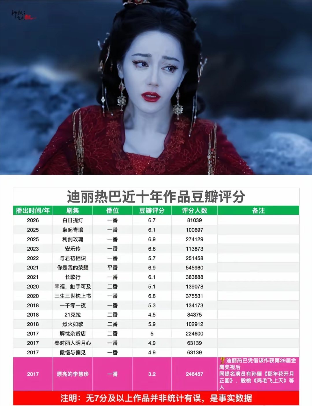 近十年,迪丽热巴最火的电视剧,评分高+打分人数最多的剧仍然是《你是我的荣耀》,还是和杨洋平番这一年应该就是迪丽热巴的颜值巅峰期了,她现在的古装造型也是静态剧宣图好看,一动起来就看着怪怪的。就说《白日提灯》里,男主死的那一段,她明明在哭,看着像在笑,笑起来的时候又像在哭,而且整个人妆感好疲惫的感觉,啧啧!