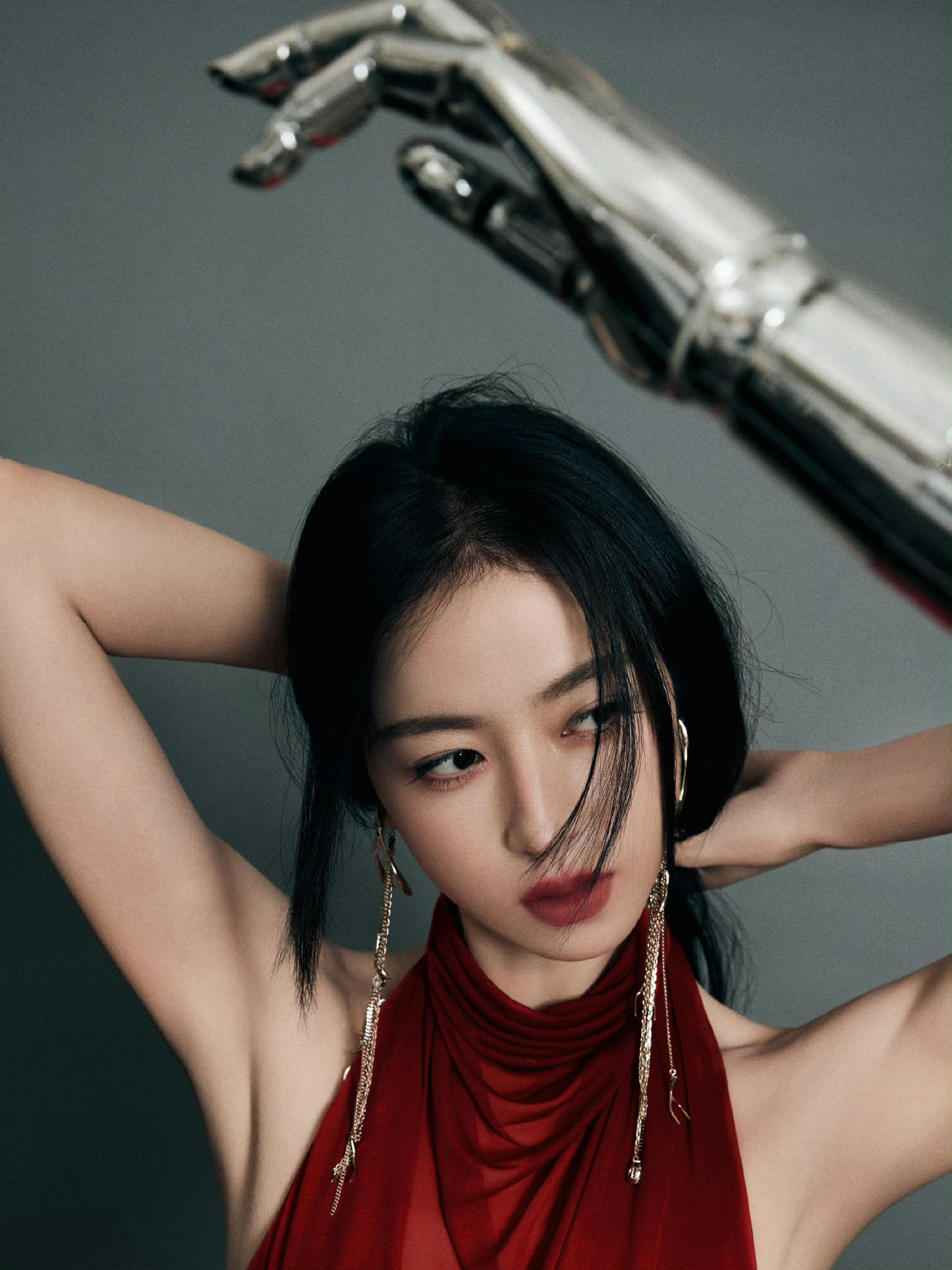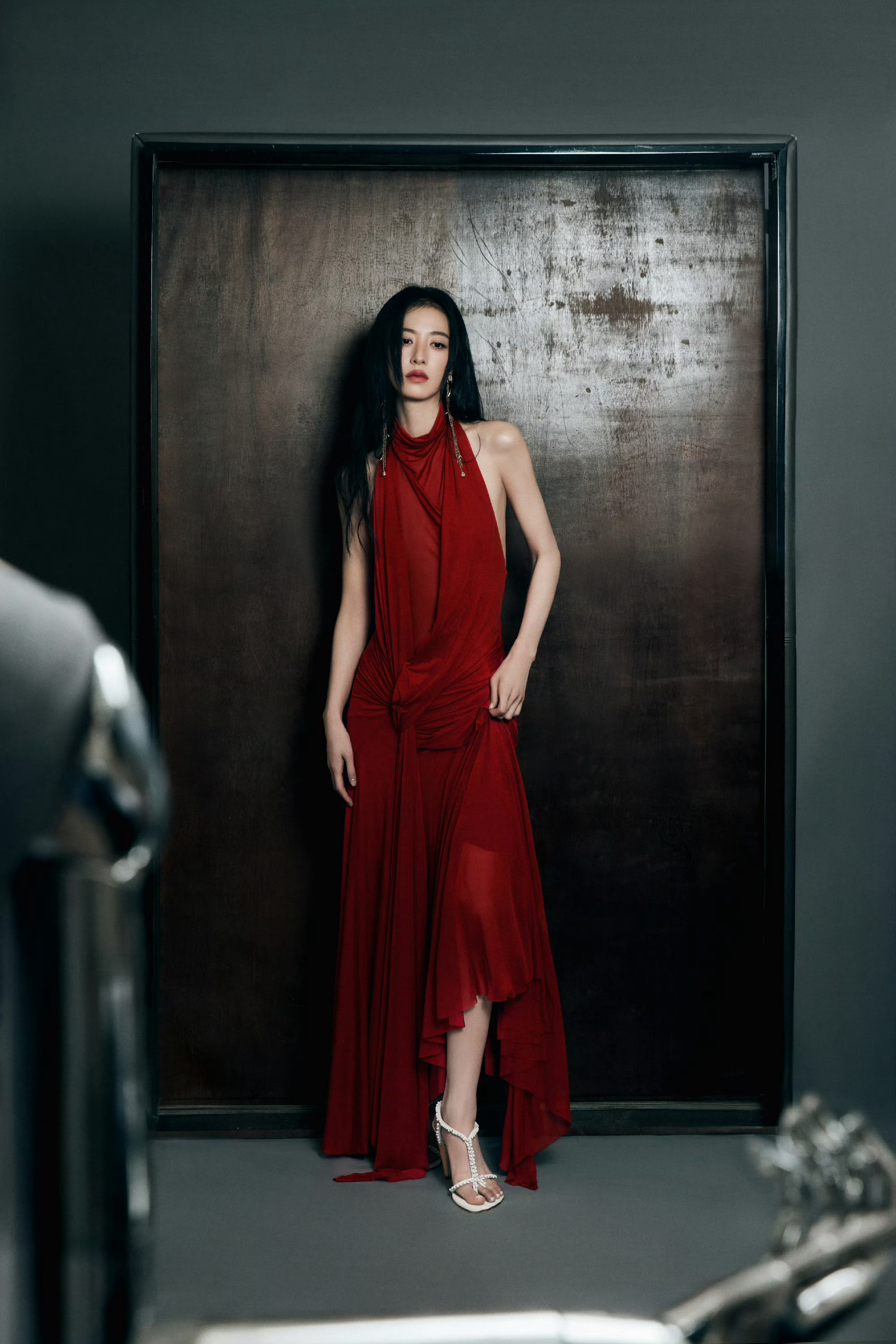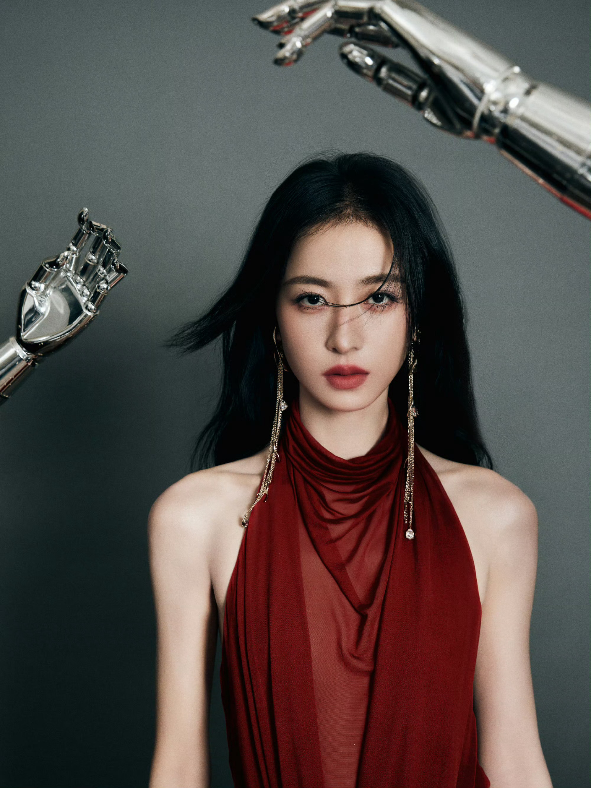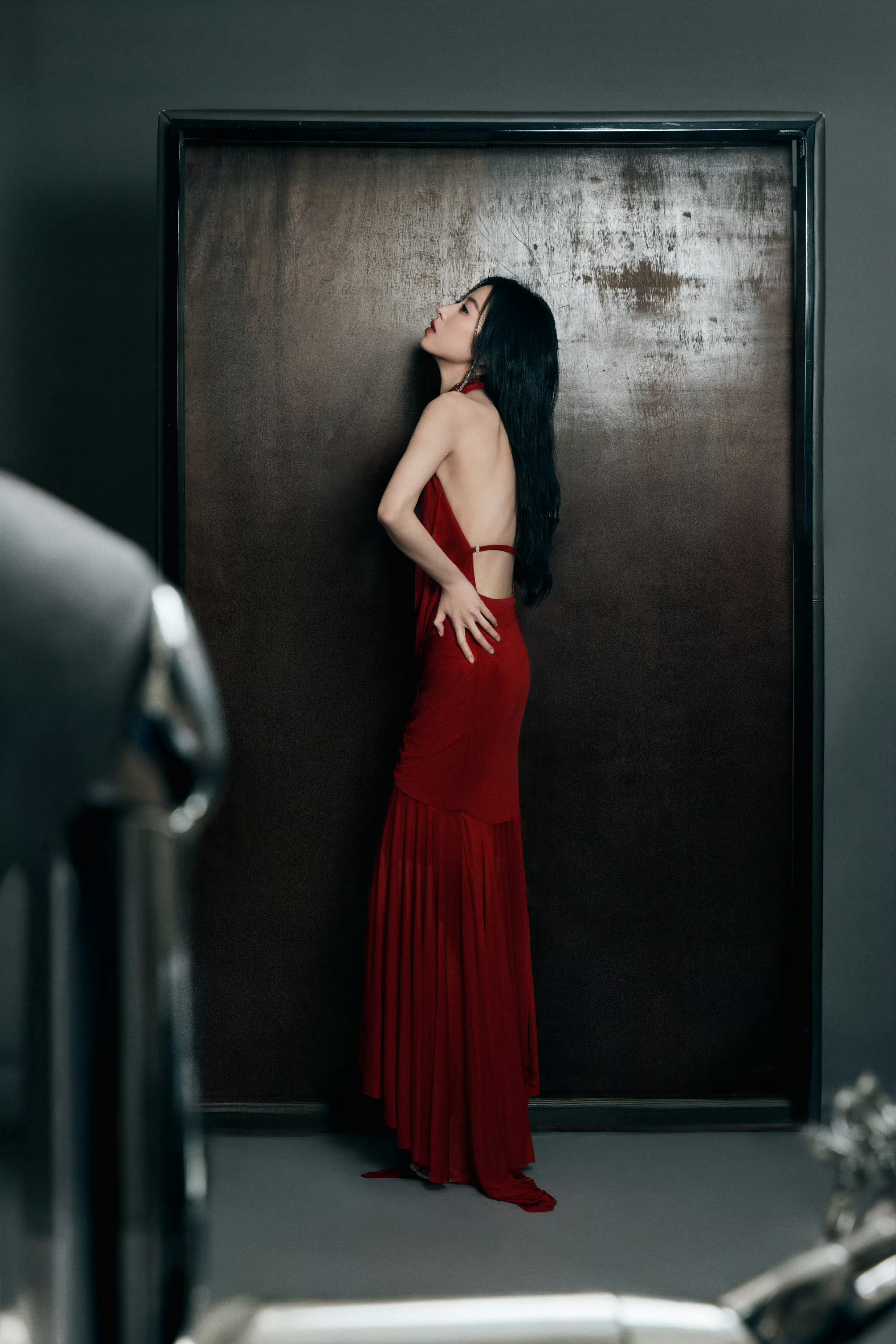 周雨彤在上海参加McQueen 2026秋冬系列静态展及酒会,身穿酒红色挂脖露背