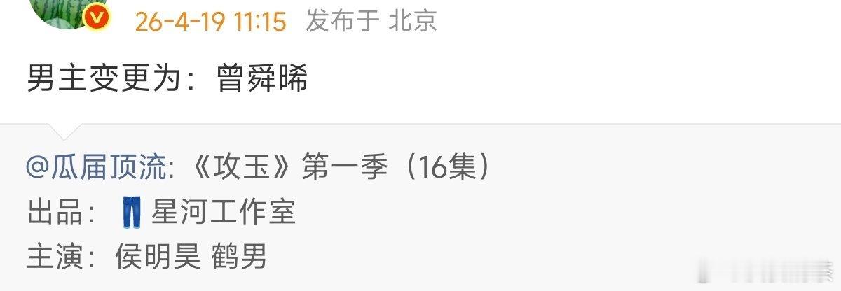 侯明昊辞演,换曾舜晞攻玉 辞演