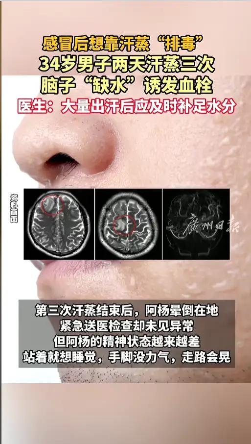 “吓得我差点跳起来!”近日,广东广州一位34岁的男子阿杨,感冒了,想着用高温汗蒸“排排毒”,结果两天内连蒸三次。没想到,第三次刚蒸完,他竟然直接晕倒了!送医院检查半天没查出啥,后来转去脑科医院,才发现竟是血栓引发的脑梗!网友纷纷戏称:“这水都被蒸干了吧!”