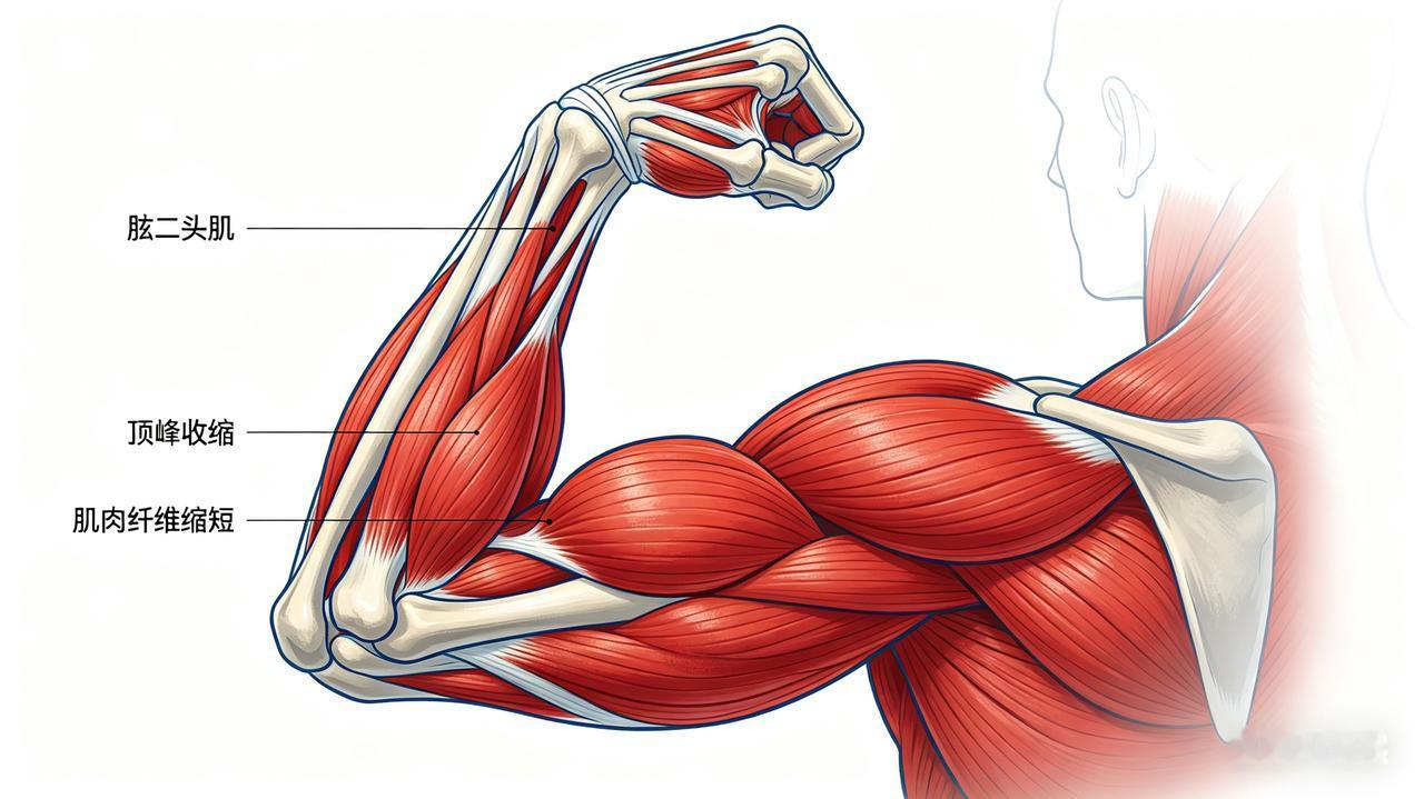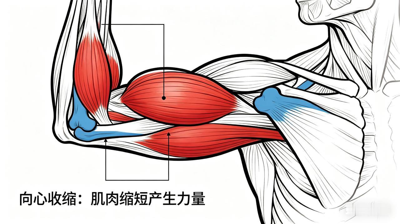 最常见的收缩方式,肌肉用力时整体变短。比如弯举哑铃,大臂肱二头肌收紧缩短,就是典型向心收缩,主要负责把重量“举起来”。